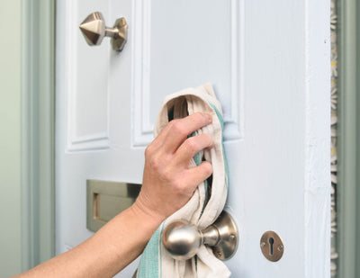 Cleaning light blue door with nickel fittings
