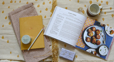 Picture ledge with book, chopping board, herbs and spices