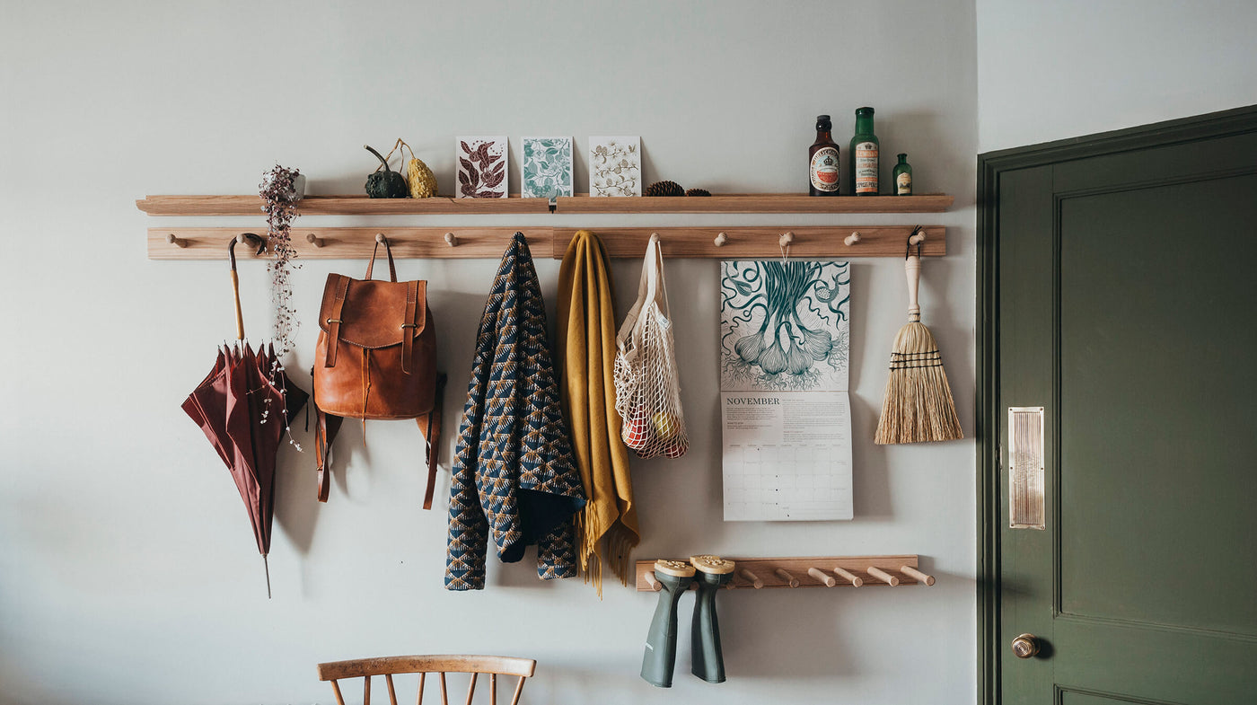 Example of an elegant hallway with coats and bags on oak peg rails and brass fittings on a traditonal door