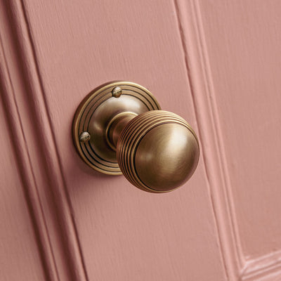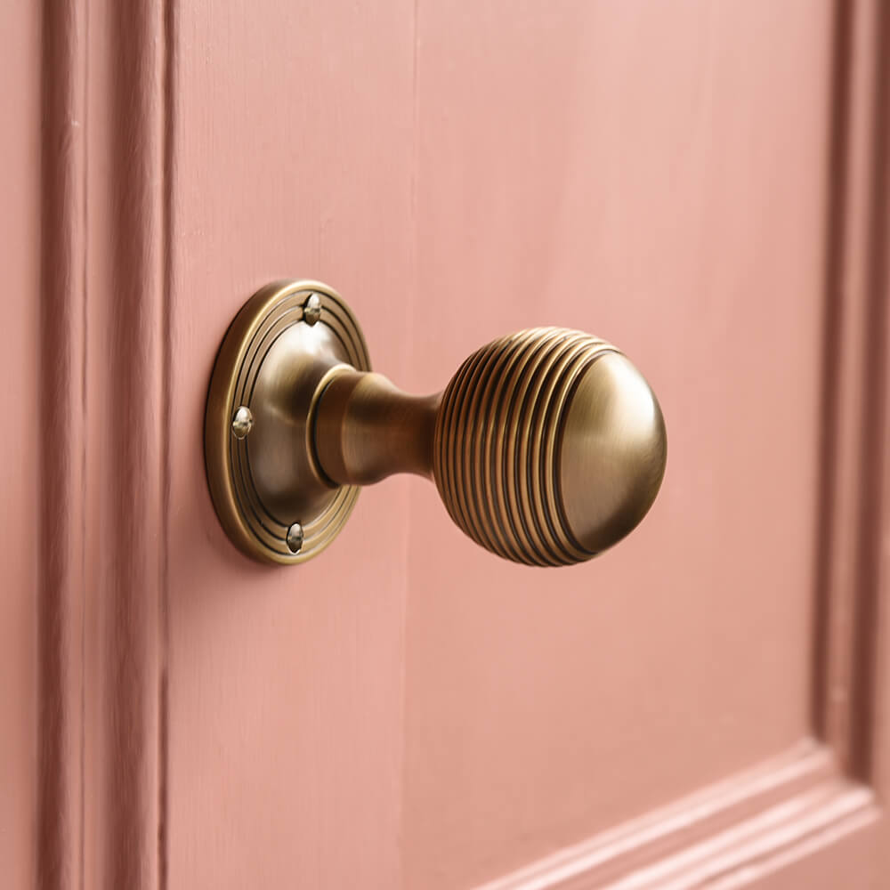 Solid brass round door knobs that are beautifully designed with reeded detailing to the handle and back plate. Also known as a 'beehive' design which was very popular during the Victorian era and into the 20th century. Hand crafted in the UK with an antique finish that is hand applied.