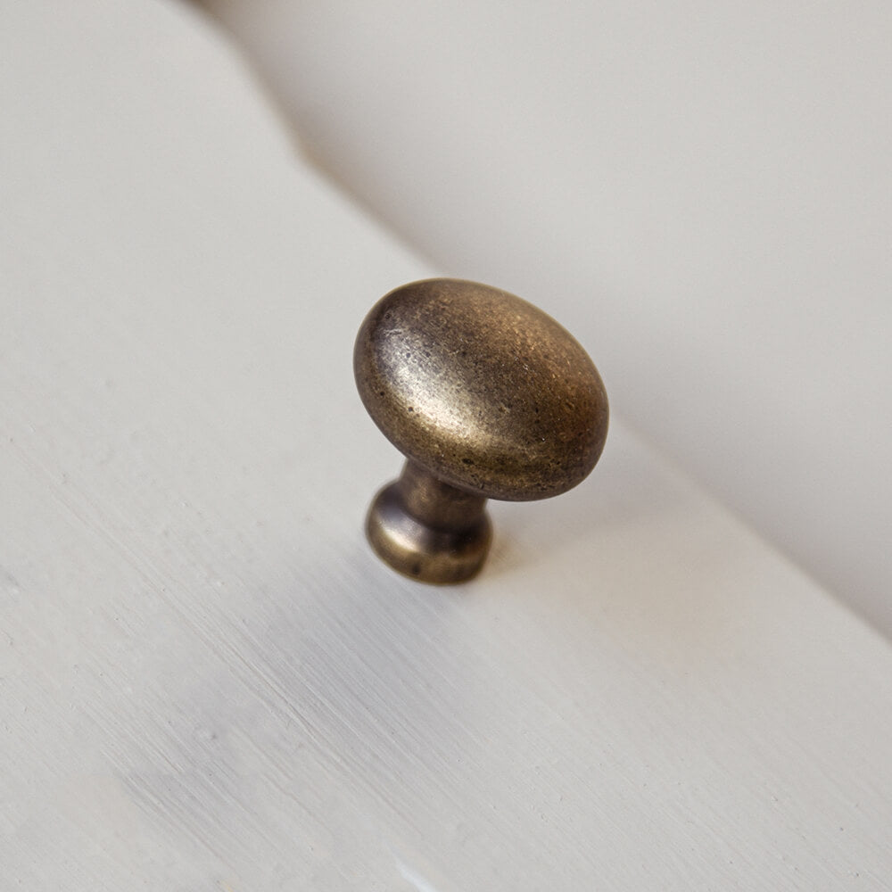 Simple and sophisticated this slightly oval cabinet knob is crafted from solid brass and then aged to a warm and timeless burnished brass finish (with clear matt lacquer applied for protection).