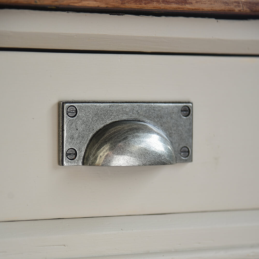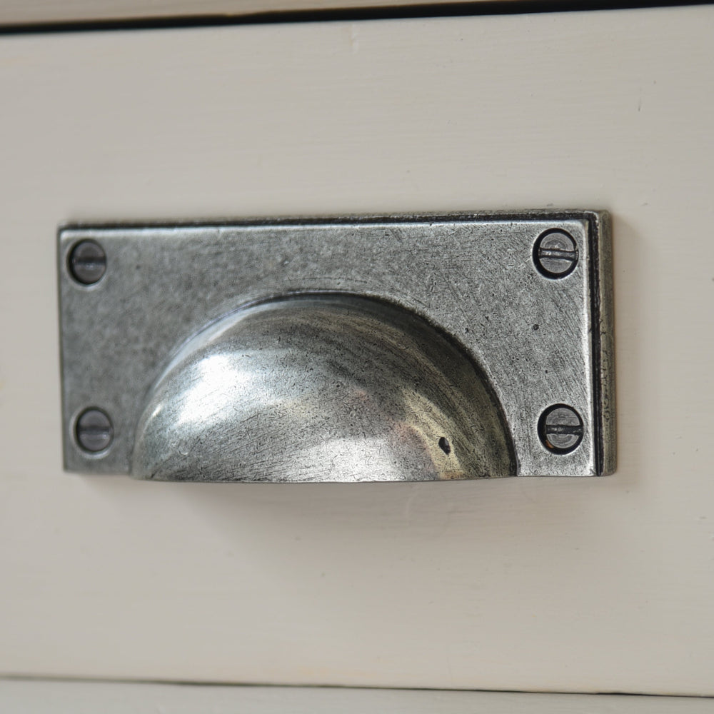 Pewter drawer pull that has a 'hooded' shape to easily grip, on a rectangular back plate. Forged from solid steel, it undergoes an ageing process that creates a soft pewter finish, afterwards a high quality, clear matt lacquer is applied for protection. Ideal for use in kitchens and bathrooms, or externally where damp conditions are expected.
