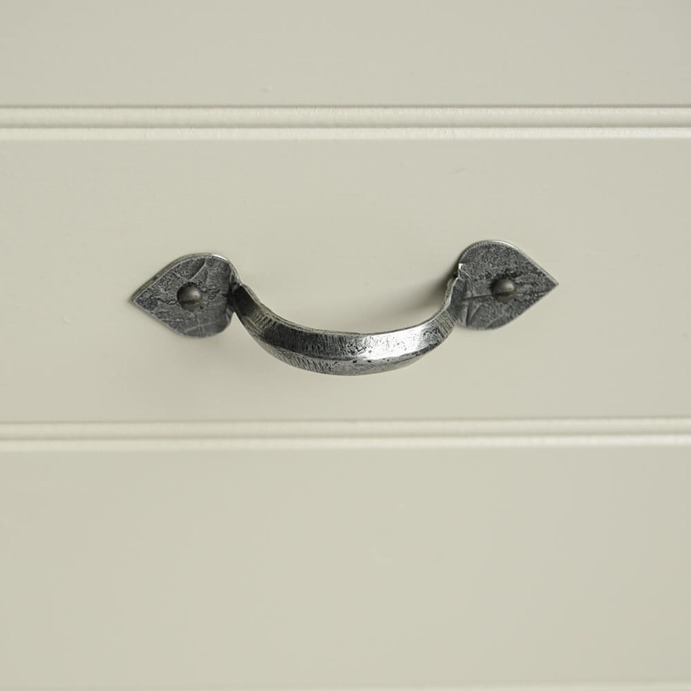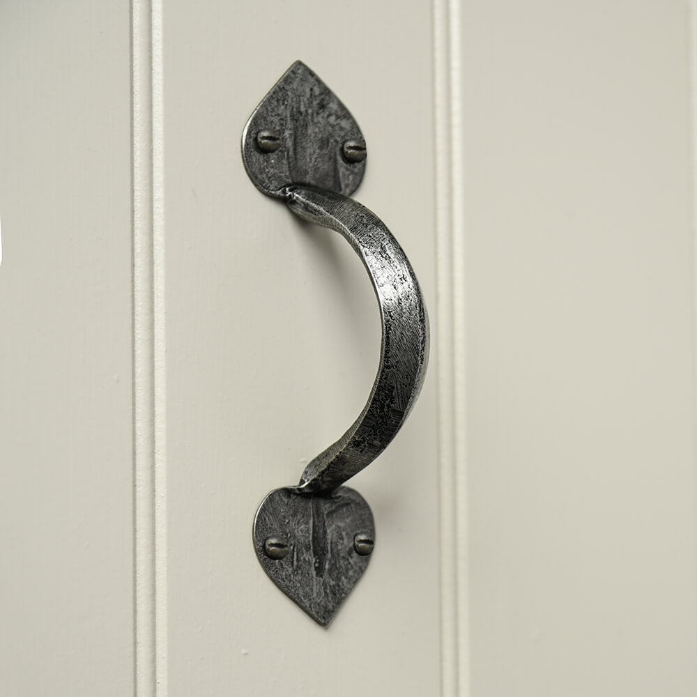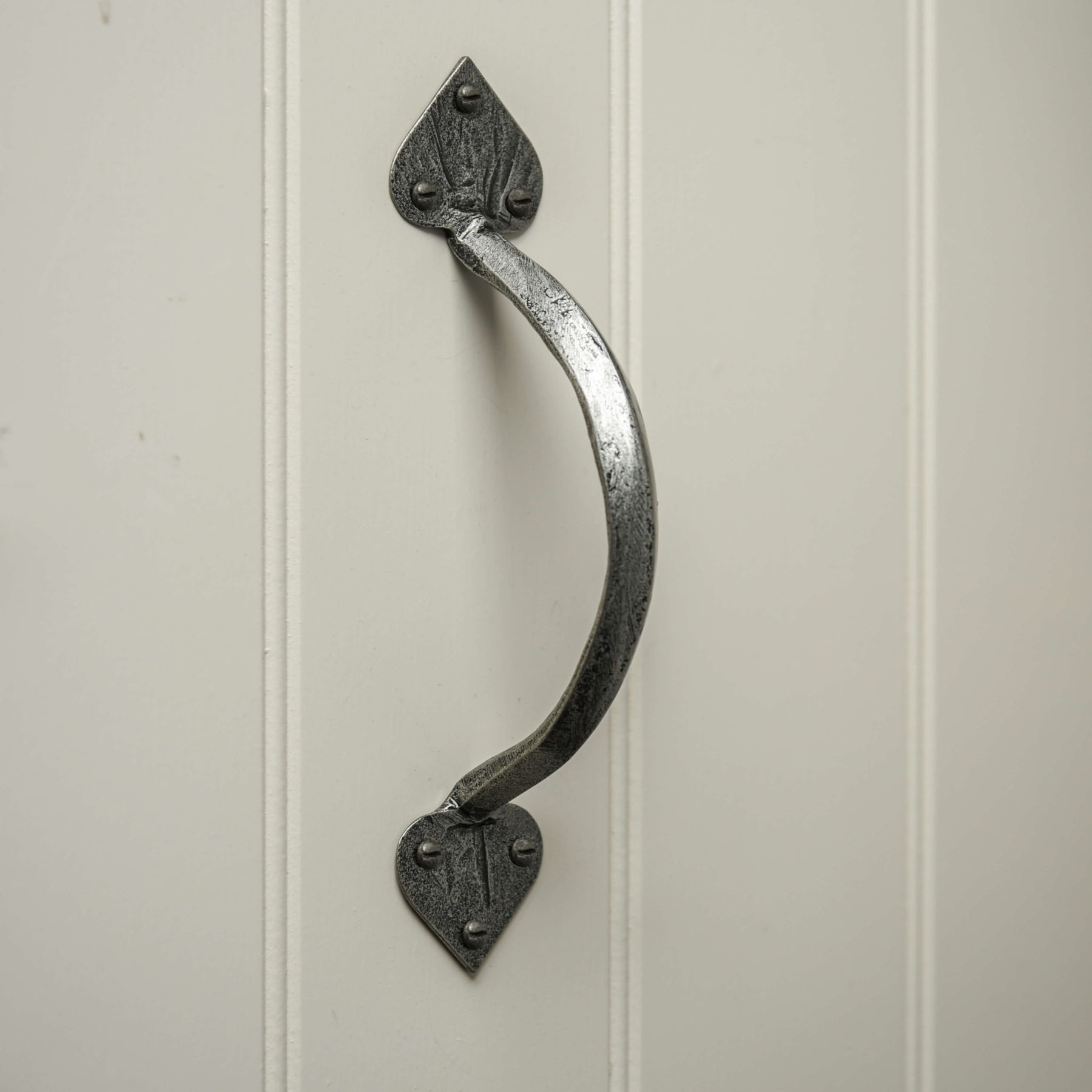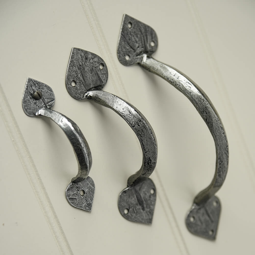 Pull handles in a gothic inspired design. Forged from solid steel with a pewter patina finish, this low maintenance finish is ideal for bathrooms and kitchens. 3 sizes available. Traditional rustic design.