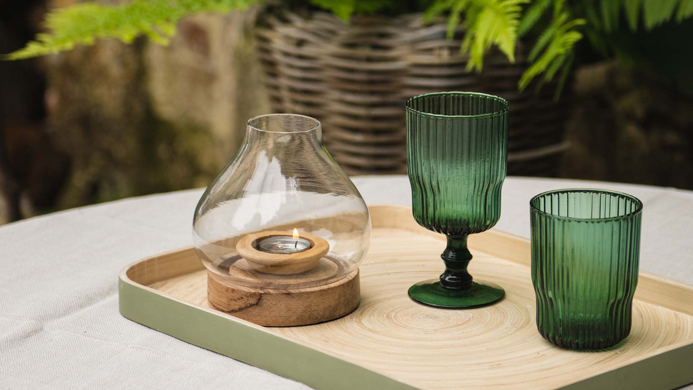 Candle Lantern on Wooden Base used on an outdoor dining table.