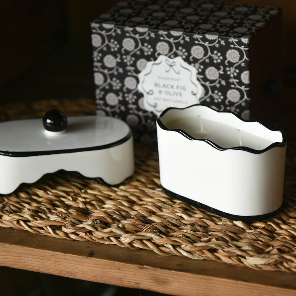 Black Fig and Olive scented candle presented in a delicate porcelain vessel, finished with hand-painted details.