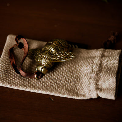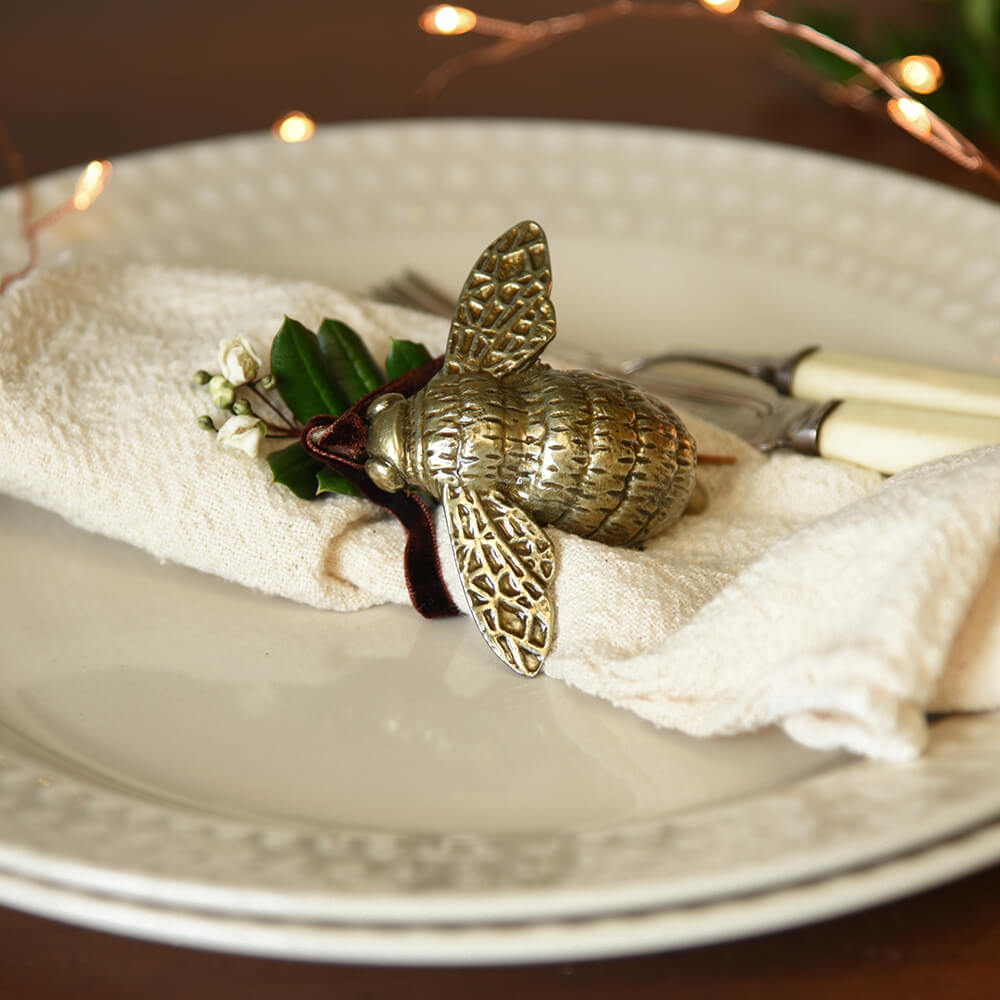 Beautifully detailed bumble bee hanging ornament, crafted from recycled metals with a fine brass coloured coating. The decoration is a miniature replica of our highly popular bumble bee door knocker. Tied with a ribbon (which may vary from photo) to be displayed on a Christmas tree or hung from a cabinet handle. Comes packaged in a linen gift bag. Also perfect for adorning folded napkins on a place setting or for giving as a luxury gift.