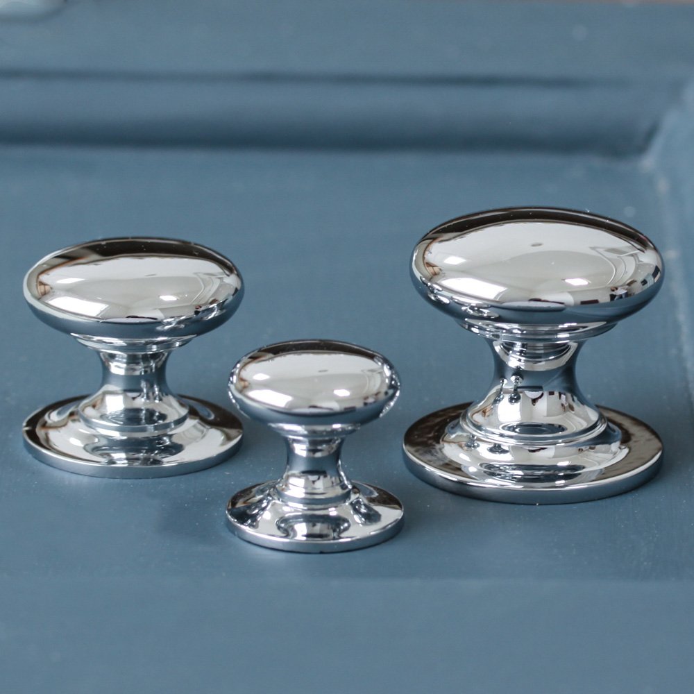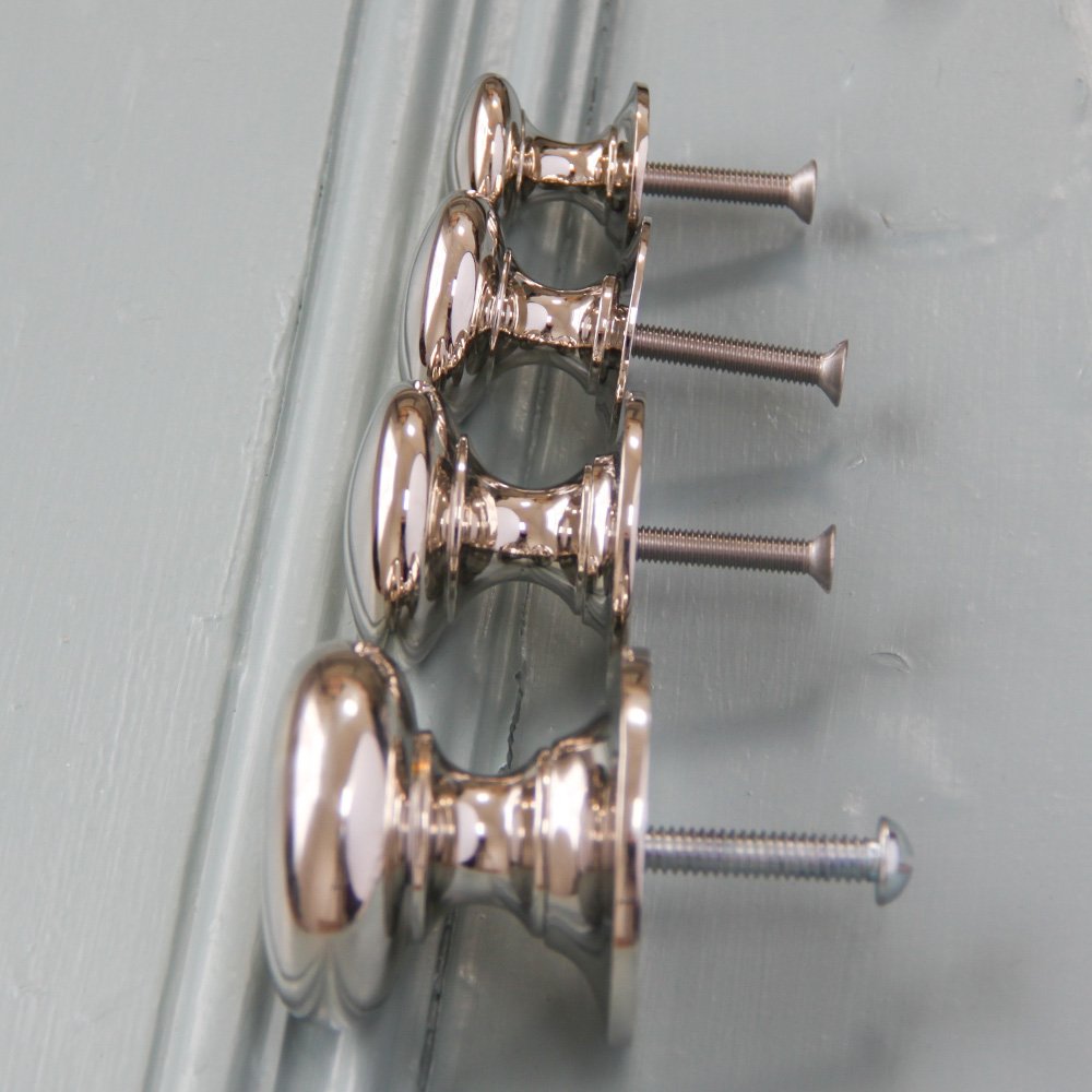 A solid brass cupboard knob with a polished nickel plated finish. Excellent quality and made in a UK foundry. Has a pleasing tactile finish and is available in 4 sizes making this handle particularly versatile and is excellent for use on kitchen cabinets, cupboards and drawers along with bedroom and bathroom furniture. These cupboard knobs fits with a simple threaded bolt that passes through from the back of the door/drawer and the knob is screwed onto the front.