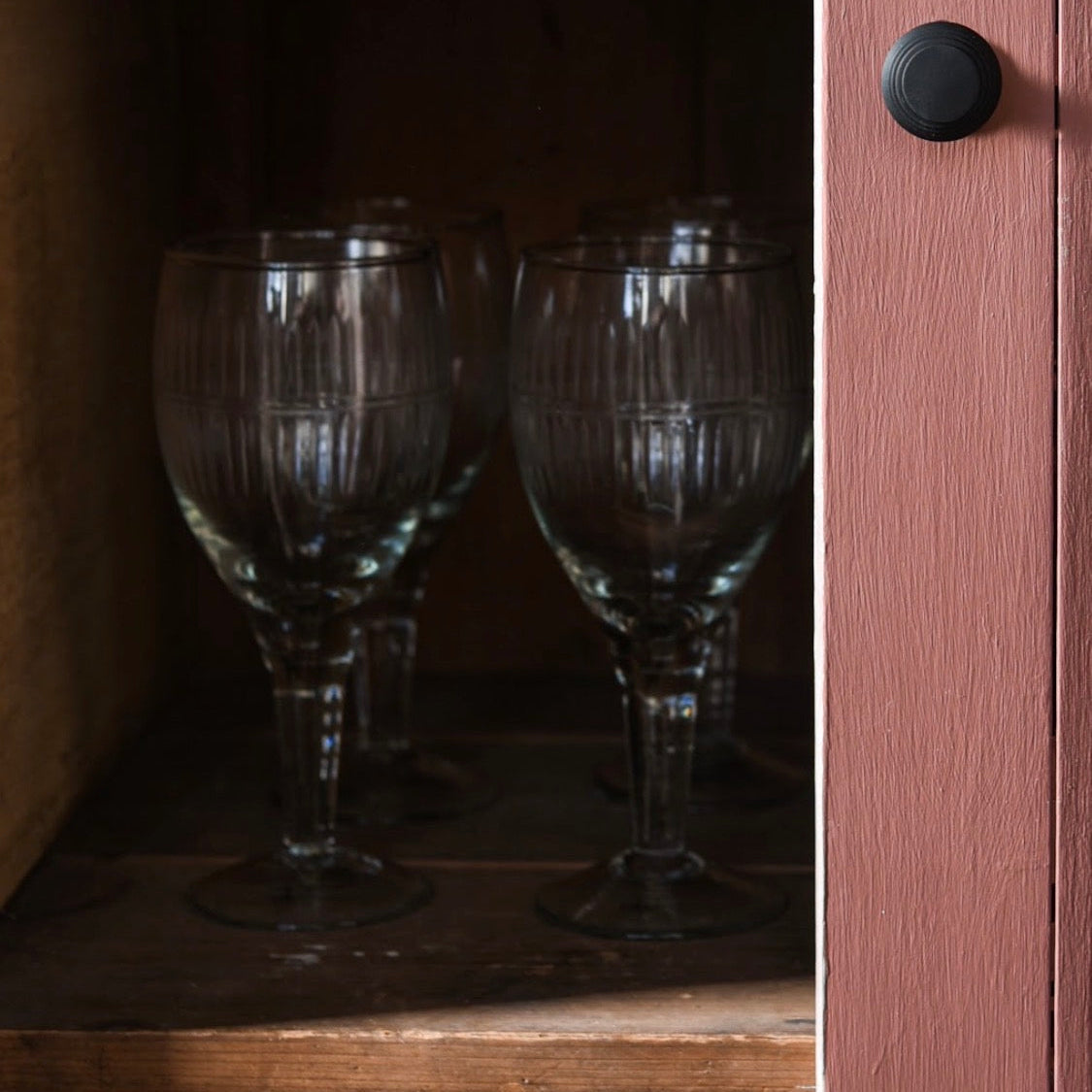A set of 4 beautiful wine glasses that have a lovely decorative etched design. Made from recycled glass using traditional techniques these glasses would look lovely on a dining table.