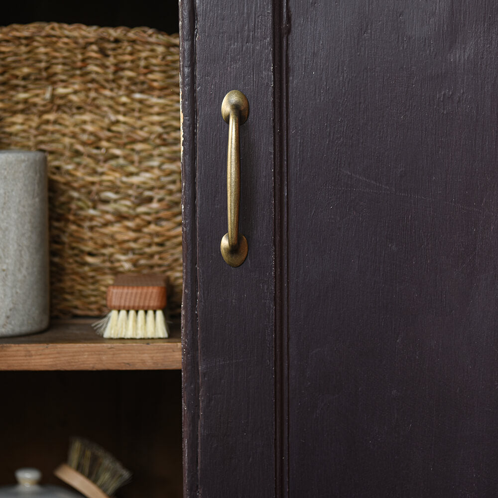 A smooth and elegantly shaped cabinet pull handle crafted from solid brass and then aged to a warm and timeless burnished brass finish (with clear matt lacquer is applied for protection).