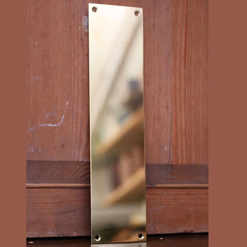 Simple door push plate that is made from solid brass with a polished unlaquered finish. Finger plates became popular between 1850-1950, they were not only used for a practical purpose but also became a decorative statement and more ornate depending on the popular style of the time.