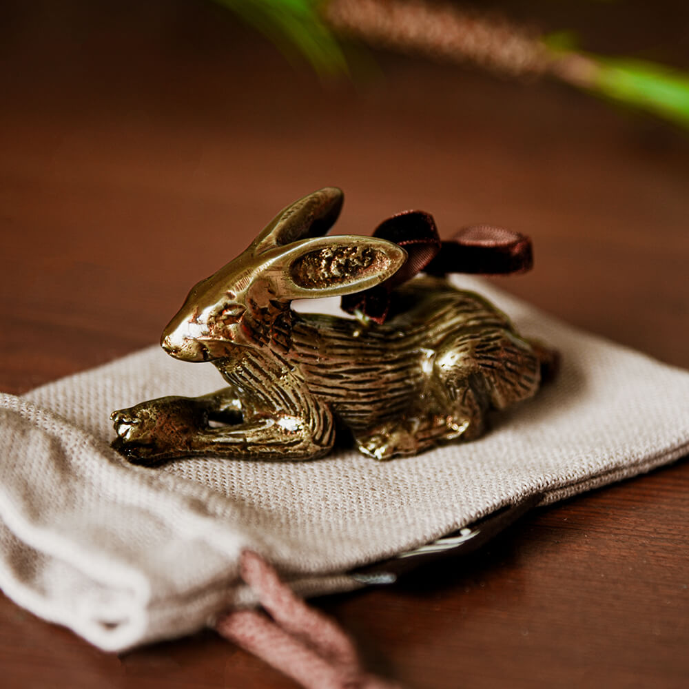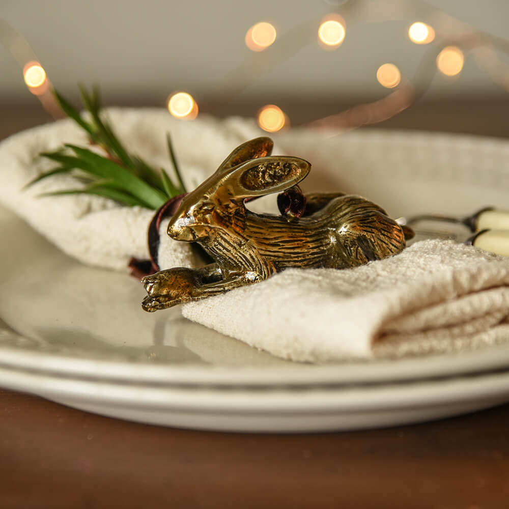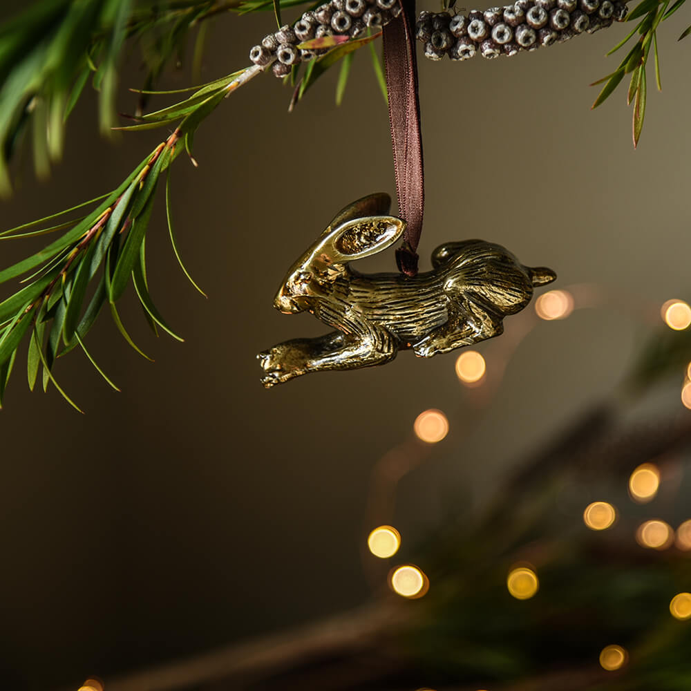 Characterful hare hanging ornament, crafted from recycled metals with a fine brass coloured coating. This beautiful decoration is a miniature replica of our popular hare door knocker. Tied with a ribbon (which may vary from photo) and can be displayed on a Christmas tree or hung from a cabinet handle.