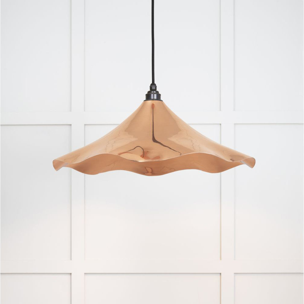 Stunning copper pendant light with an organic curved design to the shade. Crafted in the UK this light would look lovely hanging over a kitchen island or dining table, either on its own or a a row of two or three.