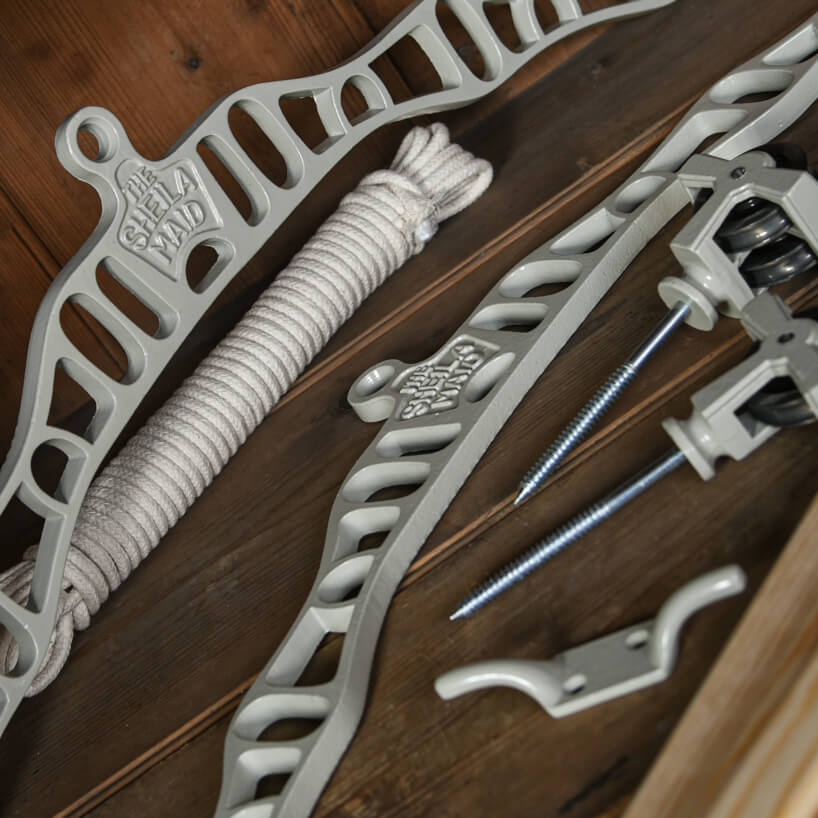 - It comes complete with everything needed to install: wooden rails, 2 cast iron rack ends, a single pulley, double pulley, cleat hook and a 10m UK manufactured cotton durable rope