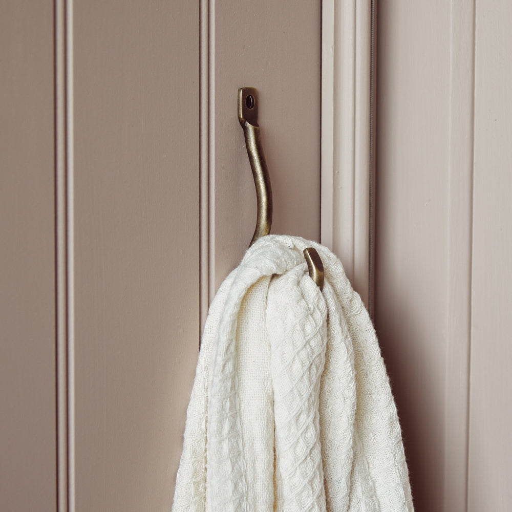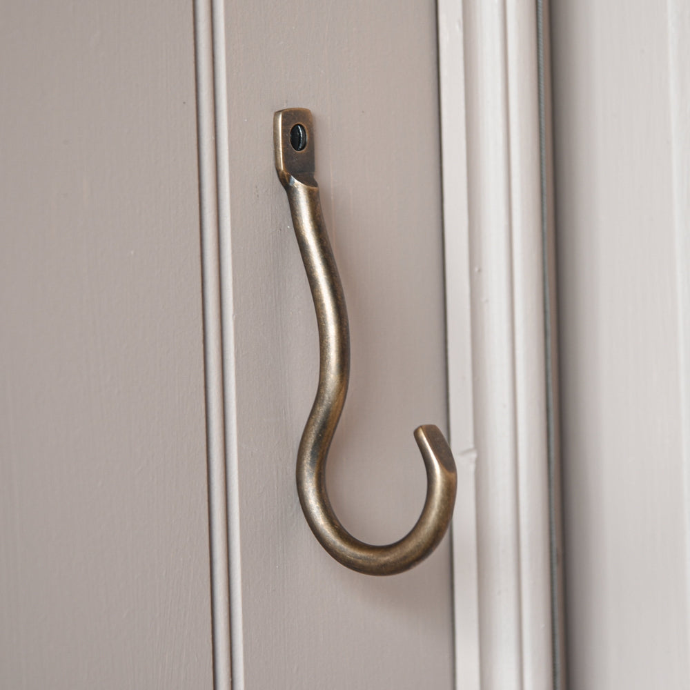 Our simple yet substantial crook shaped coat hook is cast from solid brass for longevity, then applied with a burnished brass finish (with clear matt lacquer applied for protection).