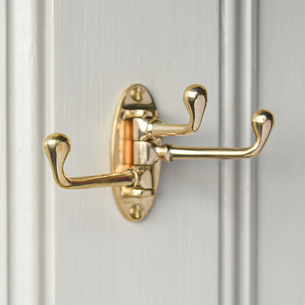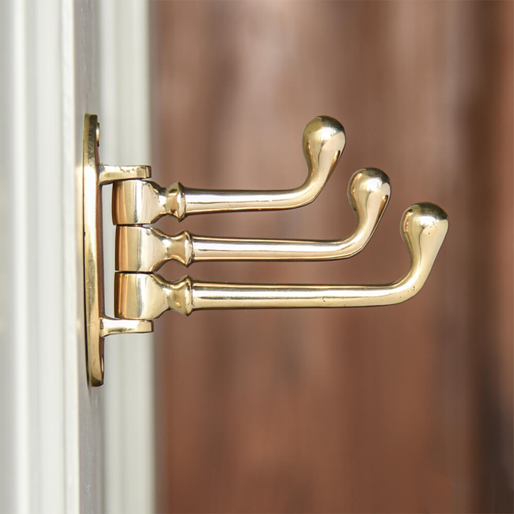 Three solid brass hinged hooks on an oval backplate. Elegantly designed with each hook varying in length. Useful in nooks and smaller spaces such as wardrobes, bathrooms and backs of doors where hanging space is valuable but limited.