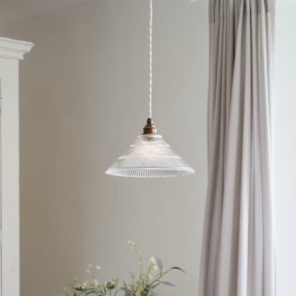 A characterful glass pendant light in a classic French style. The fluted glass shade softly diffuses light, creating a gentle, ambient glow, while the old English bronze coloured fixtures add depth and warmth.