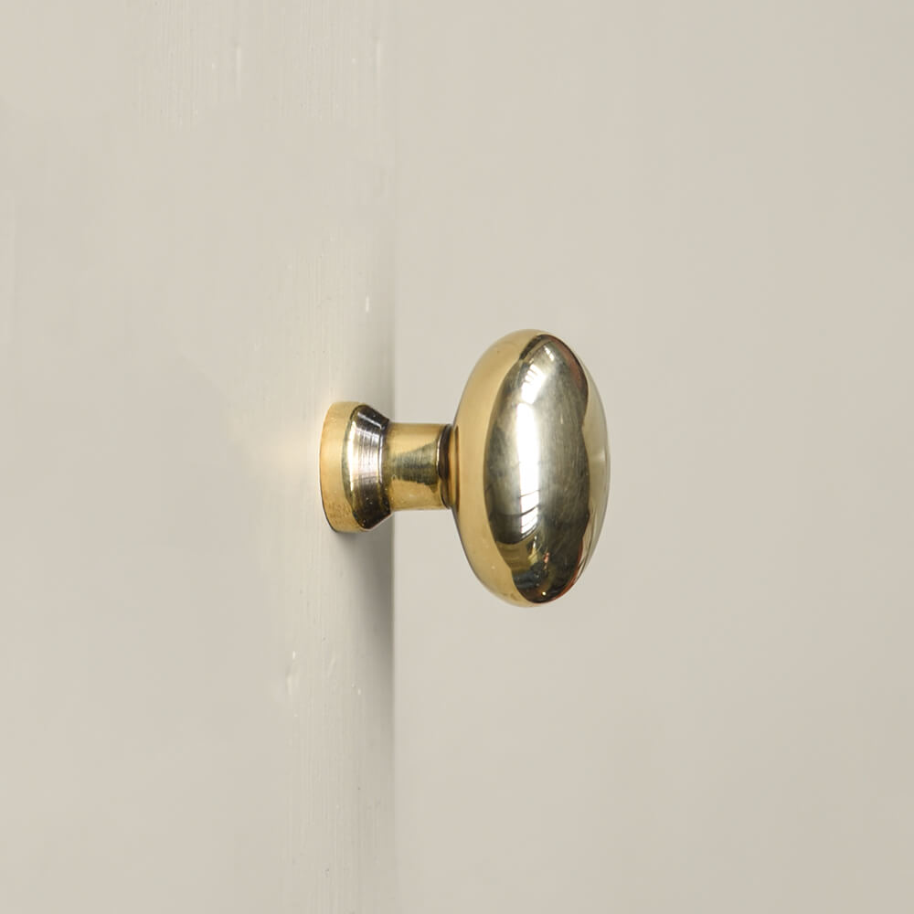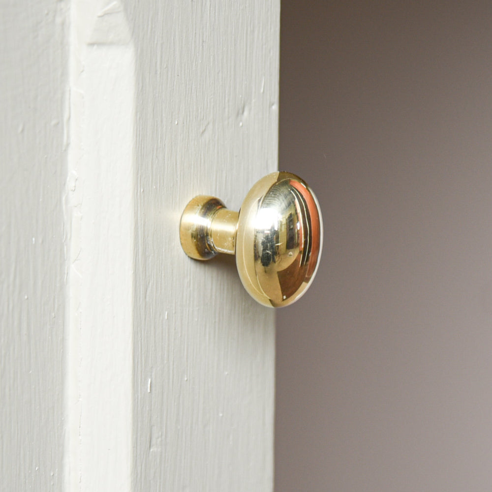 Small oval cabinet knob crafted from solid brass with a lightly aged finish, incorporating a darker patina in recessed areas. Available in three sizes, these elegant and tactile knobs will work beautifully on kitchen cabinets and drawers, wardrobes and storage cupboards.
