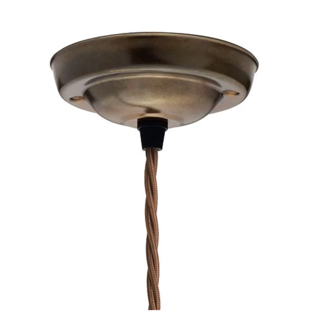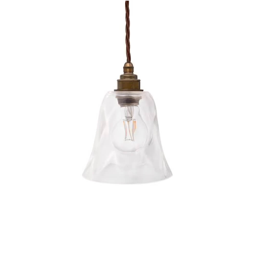 A decorative glass pendant with a soft, dappled form, antique bronze coloured fixtures and traditional twisted brown flex. The diffused glass creates a subtle play of light, adding warmth and atmosphere while still allowing effective illumination.
