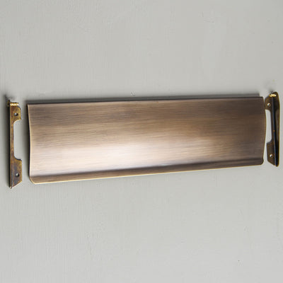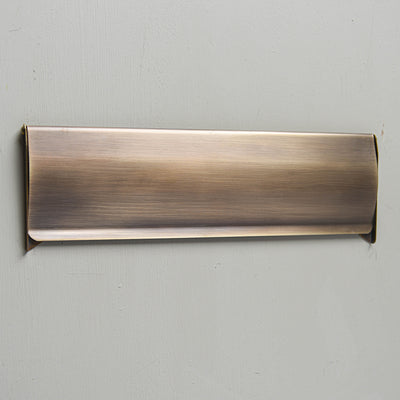 Curved letter tidy that fixes to the internal side of your door to cover the hole and fixings of your letterplate. Made from pressed brass with a light antique finish hand applied to give the brass an authentic soft aged look. Will help reduce draughts and simply lifts up when post is push through the letter box.