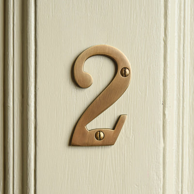 Traditional solid brass house numbers with a light antique finish hand applied. Crafted in a UK foundry and supplied with matching brass screws. Easily secured to your front door or wooden gate.
