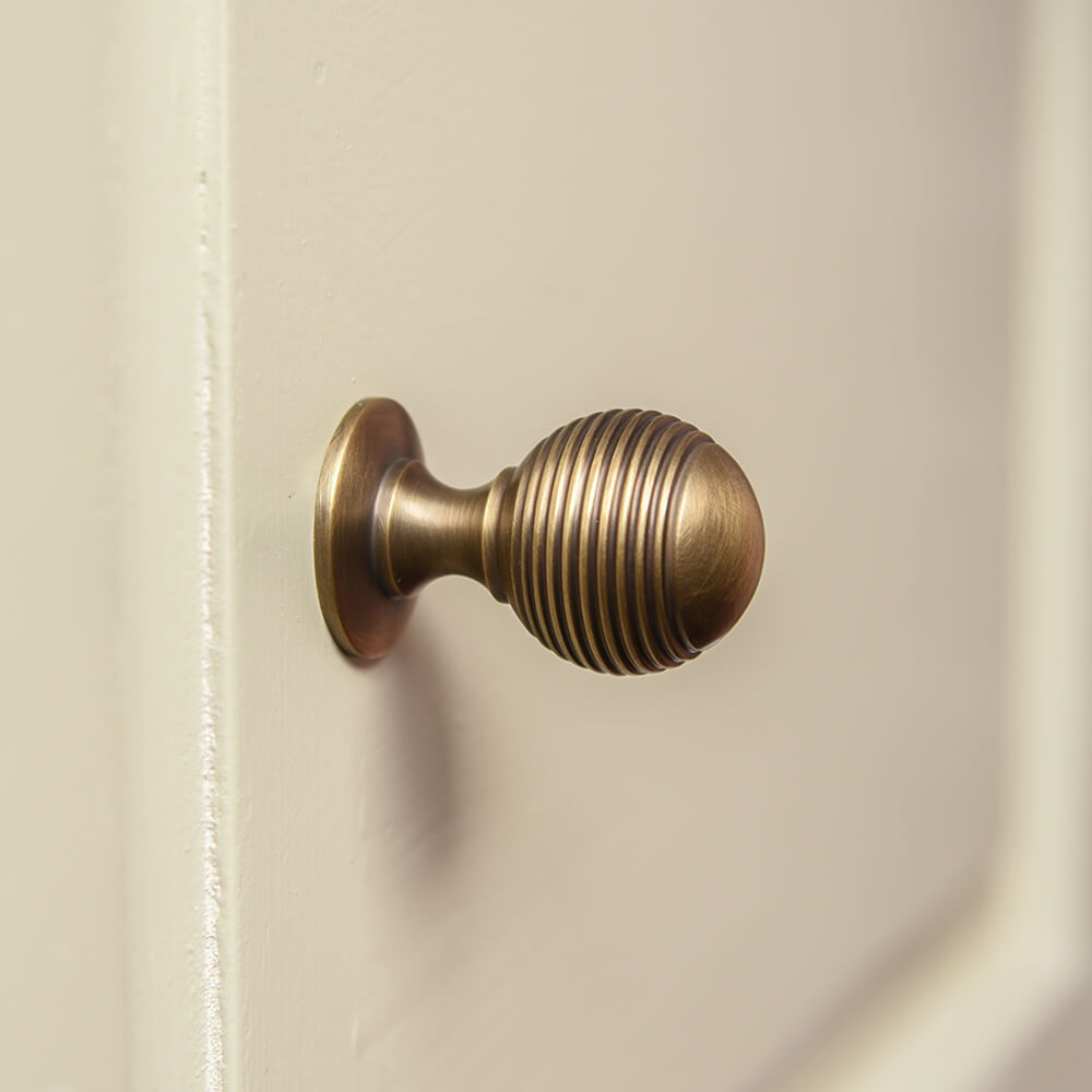 Solid brass reeded cupboard knob that is finished with a hand applied brushed antique appearance. Hand made in a UK foundry, this high quality cabinet handle would suit a range of cupboards, drawers and wardrobes and is available in 2 sizes in a classic design known as 'beehive'.