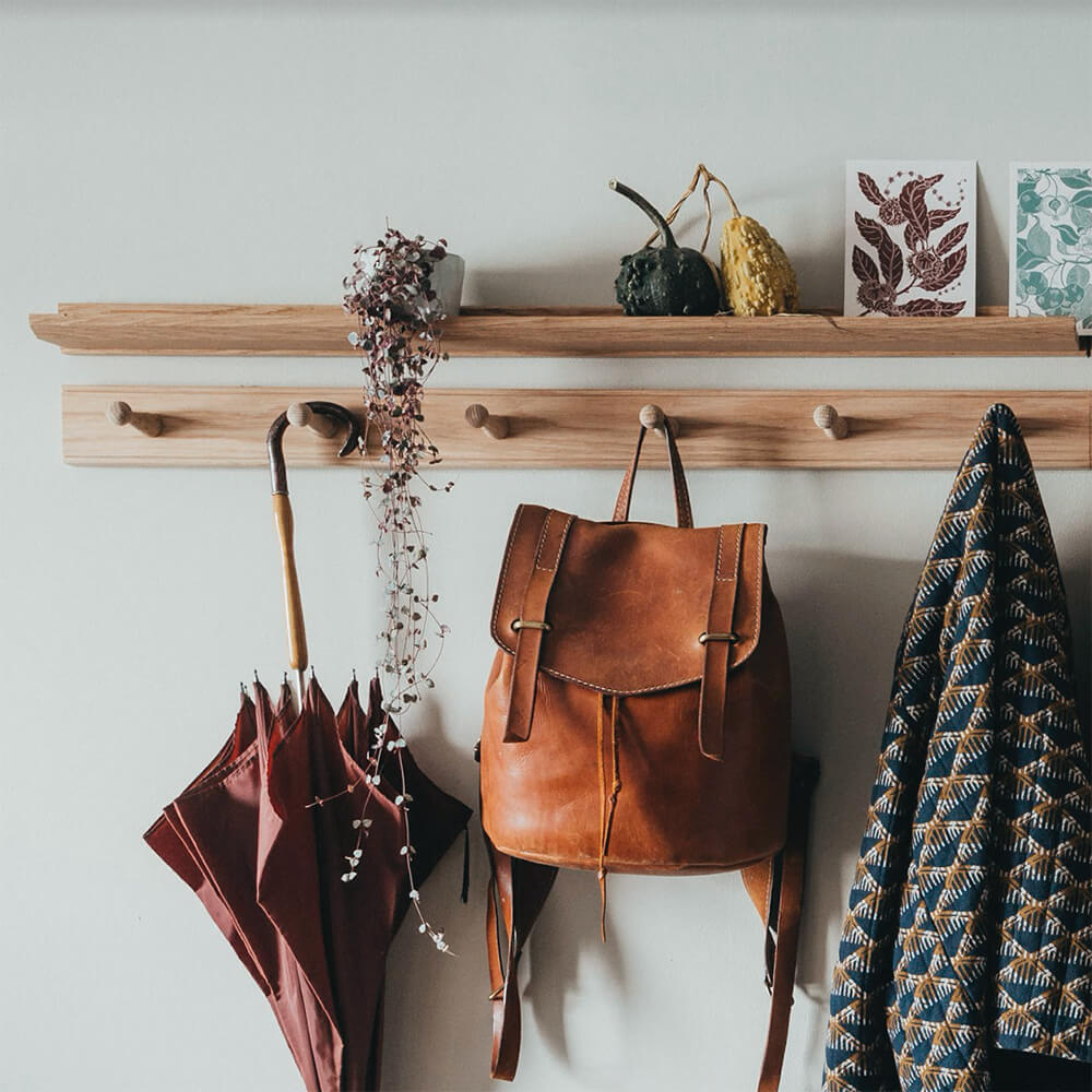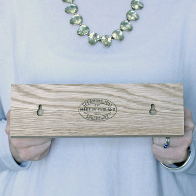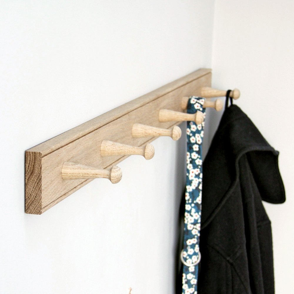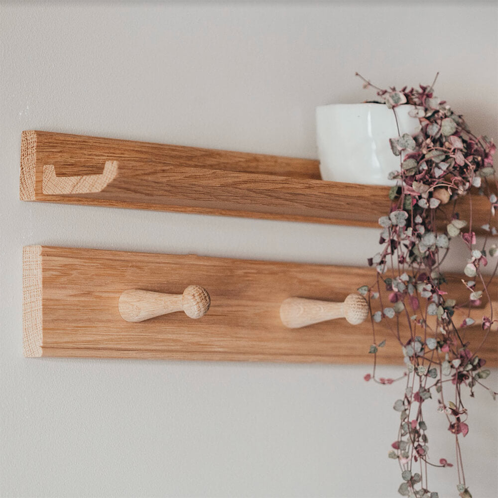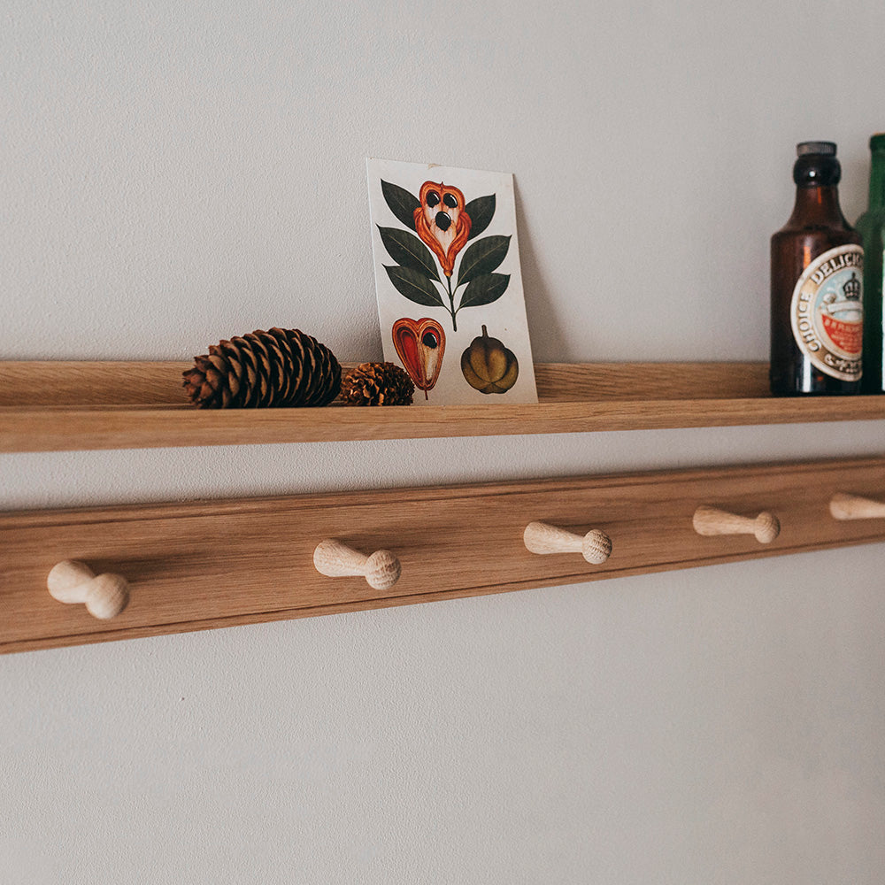A beautifully crafted oak hook rail, perfect for hats and coats. 2, 4 or 6 pegs on a piece of solid oak with a groove top and bottom. These beautifully simple utilitarian rails can be installed end to end to create one long wall of hooks which are super useful and have a very stylish shaker appearance. Matches perfectly with our Oak Picture Ledges, as seen in the images.