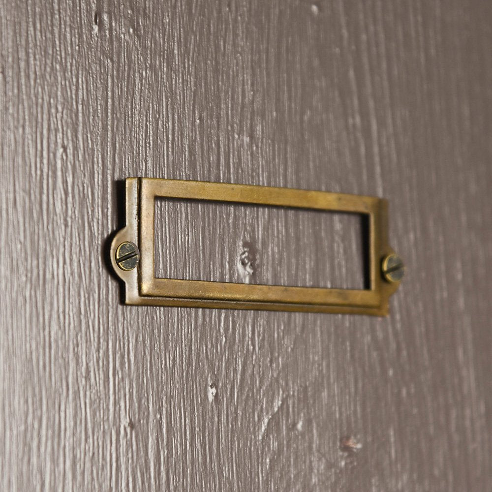 A card label frame in an authentic and functional design with an antique brass finish. Traditionally used for labelling drawers and cupboards at home or at work.