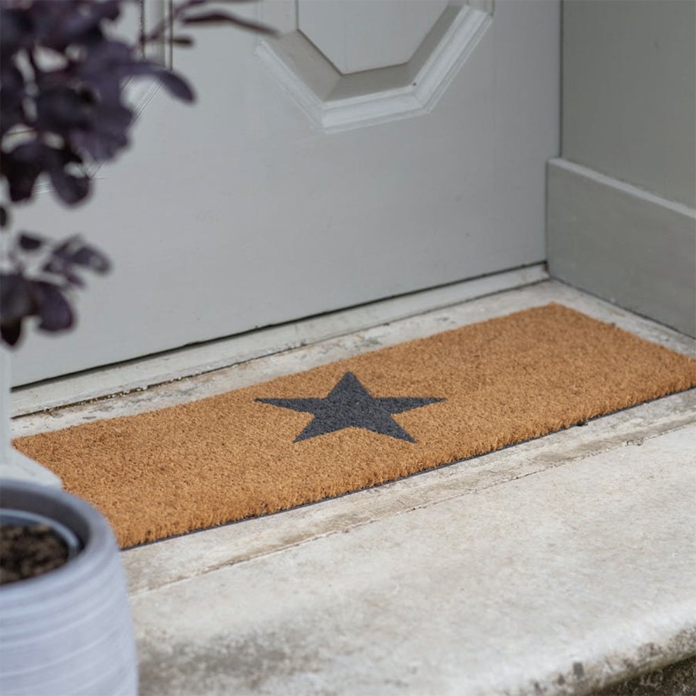 Narrow doormat made with coir. Tan coloured with black star in center.