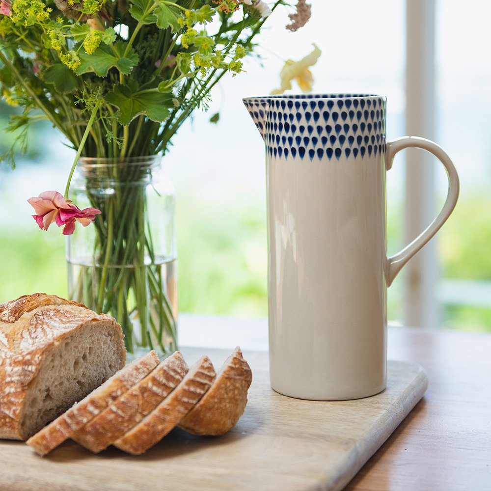 White & Blue Indigo Drop Design Tall Water Jug on Dining Table