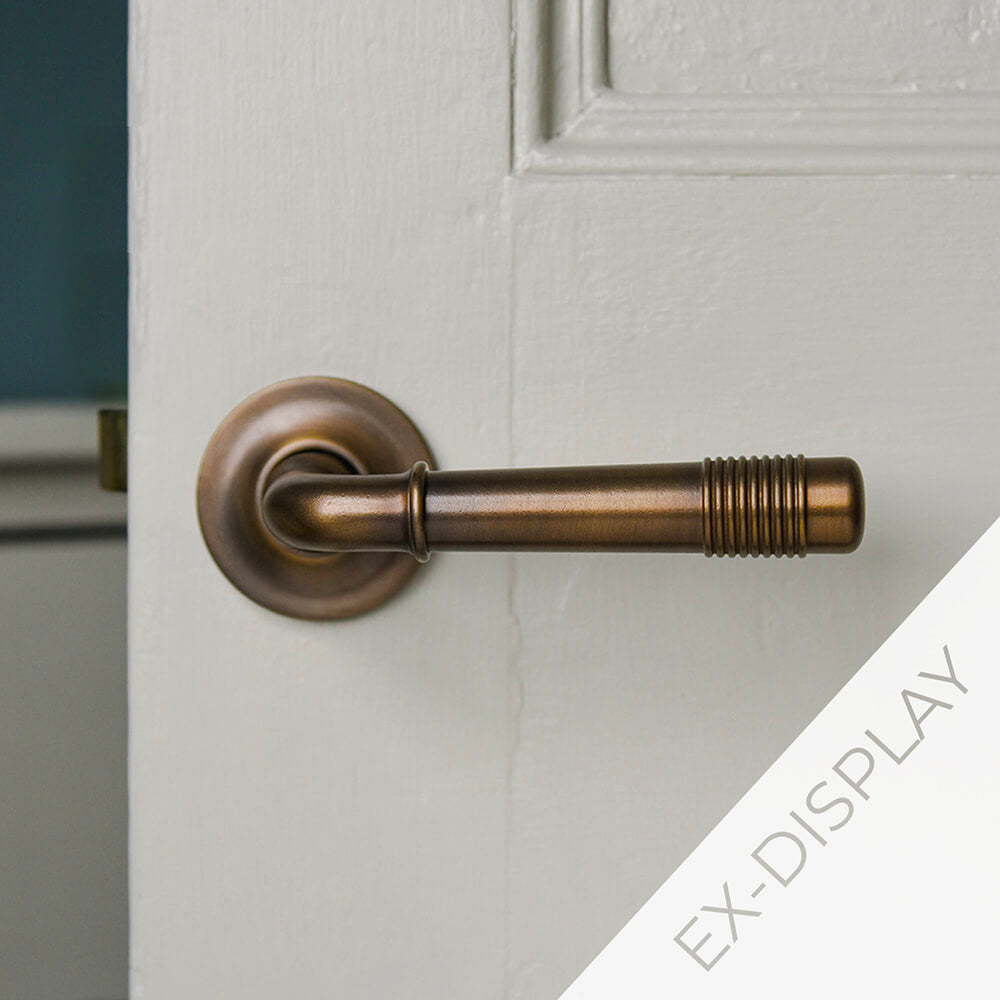 Beautiful lever handles made from solid brass with a distressed antique finish that is hand applied and is known as a living finish that will continue to evolve and age over time. Elegant door handles with a round concealed backplate and reeded detailing to the handle.