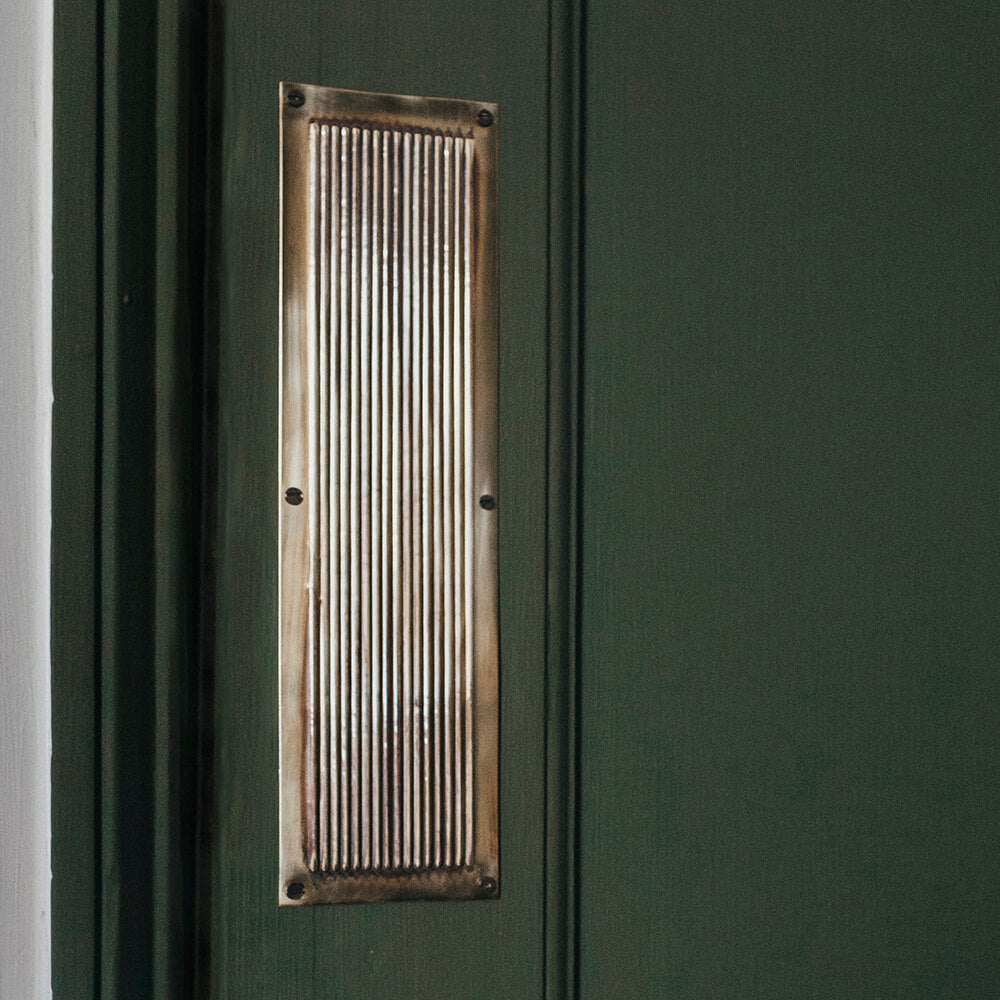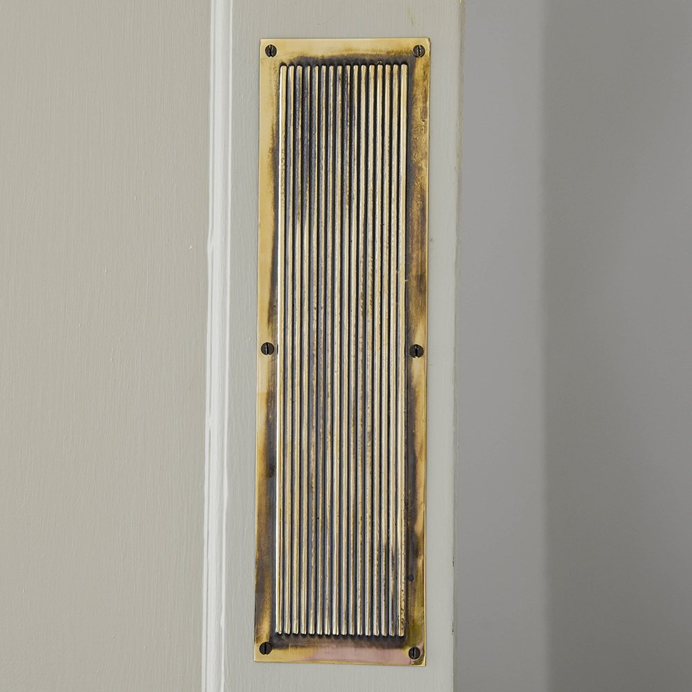 Pressed brass fingerplate with a slightly aged finish in a elegant reeded 'beehive' design. Finger plates became popular between 1850- 1950, they were not only used for a practical purposes but also became a decorative statement and more ornate depending on the popular style of the time. The finger plate is also known as a push plate or a door plate. Also available in nickel.