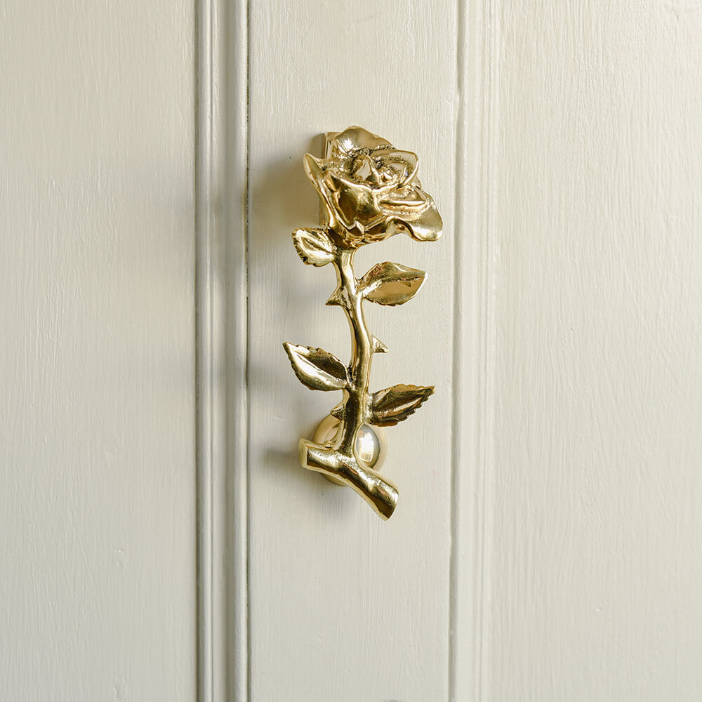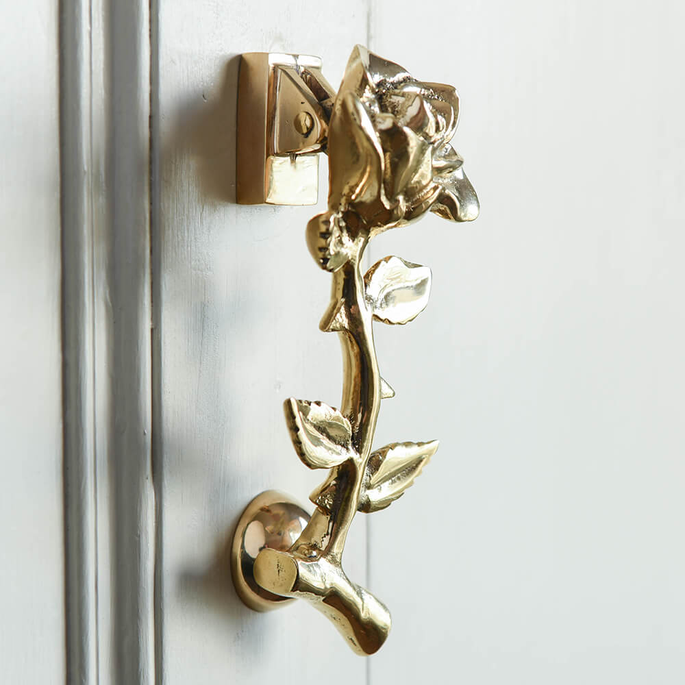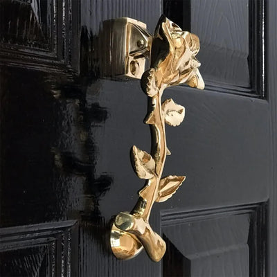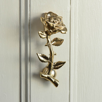A beautifully designed rose door knocker that is made from solid brass with an antiqued finish. The rose head sits at the top on the door fixing and the stem is used for the knocker. Delicate yet substantial this door knocker would look gorgeous on your front door.