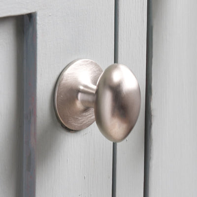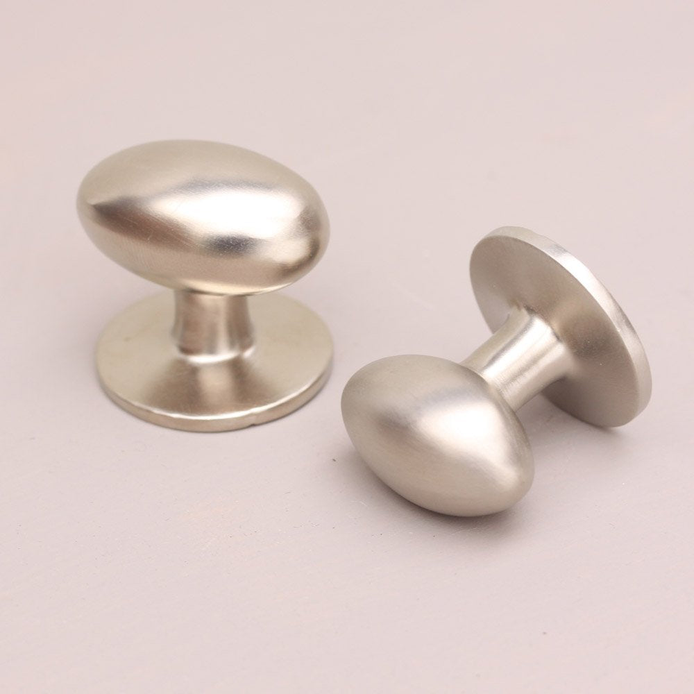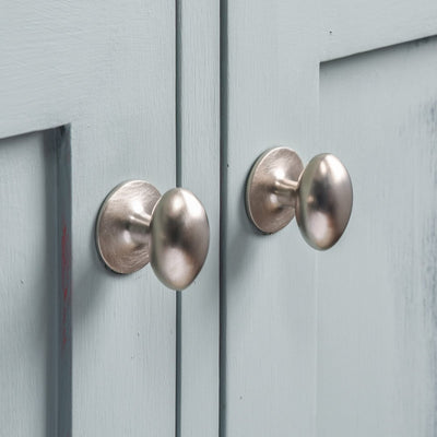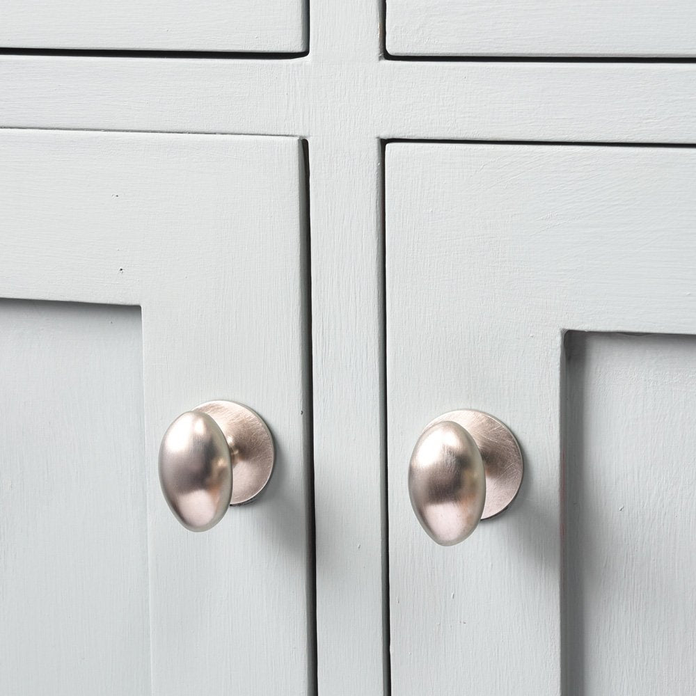 Elegant oval cabinet knobs crafted from solid brass with a brushed nickel plated finish. Beautifully tactile, these cupboard knobs are hand made in a UK foundry. Excellent for use on kitchen cabinets, cupboards and drawers along with bedroom and bathroom furniture.