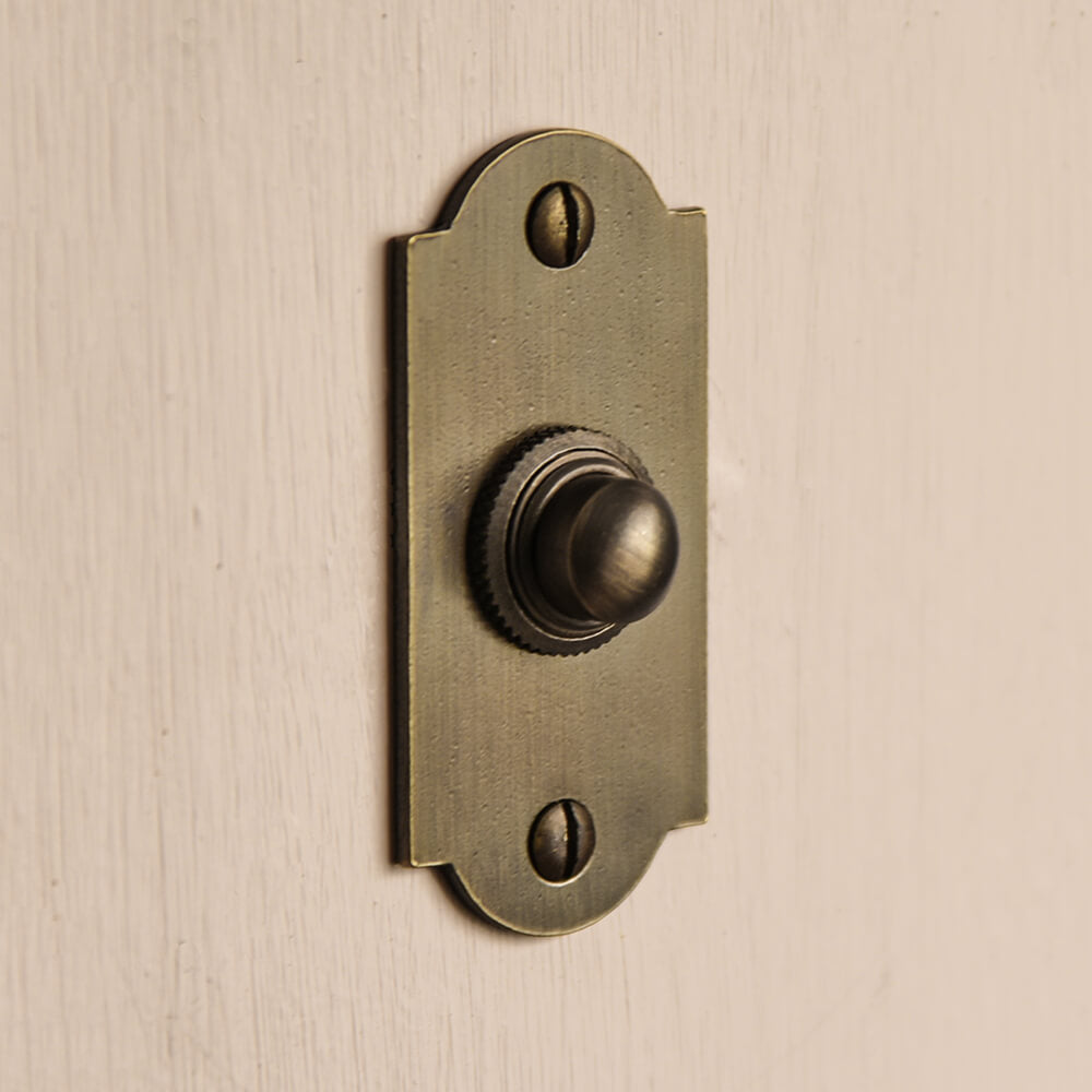A classically styled arched bell press in distressed antique brass. British made and built to last with a satisfying 'push' button.
