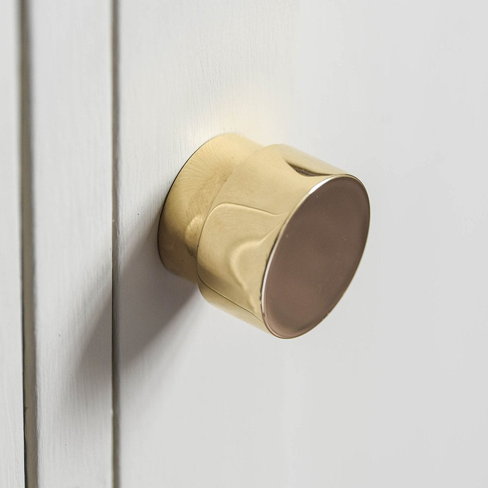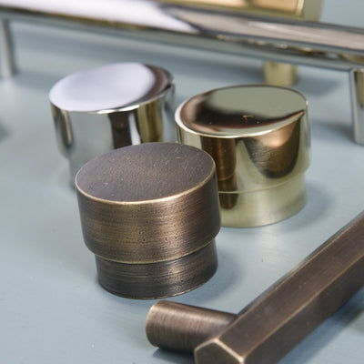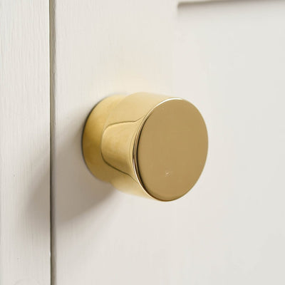 Weighty flat round cabinet knob that is crafted in a UK foundry from solid unlacquered brass. Superb size that would work well on kitchen cabinet drawers and doors. Team with the round pull handles to complete the look.