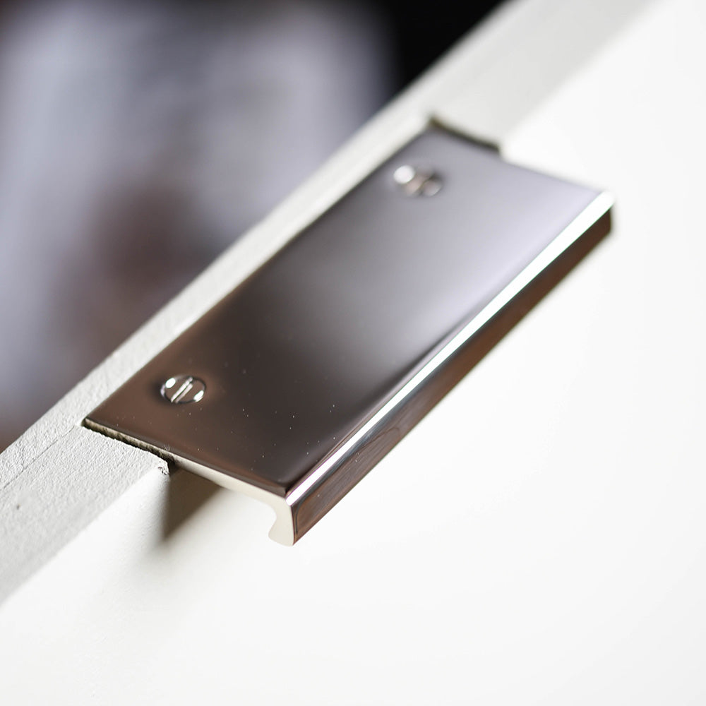 Seamless cabinet edge pull, handcrafted in a UK foundry with a distinct Mid Century appeal. Made from solid brass with a polished nickel plated finish, this sleek design looks stunning on contemporary kitchens and built in furniture. Can be used for both doors and drawers and is designed to be counter sunk.