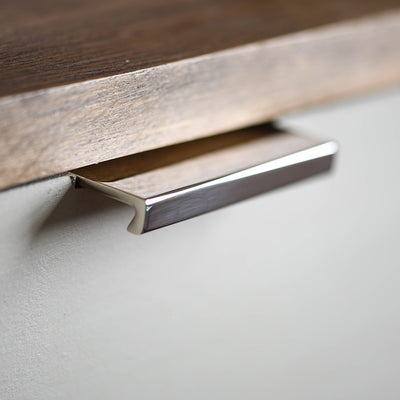 Flat Cabinet Edge Pull in polished nickel finish on drawer.