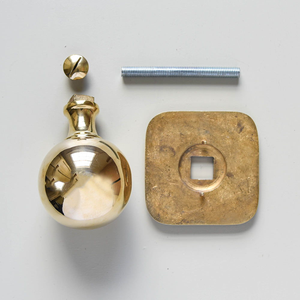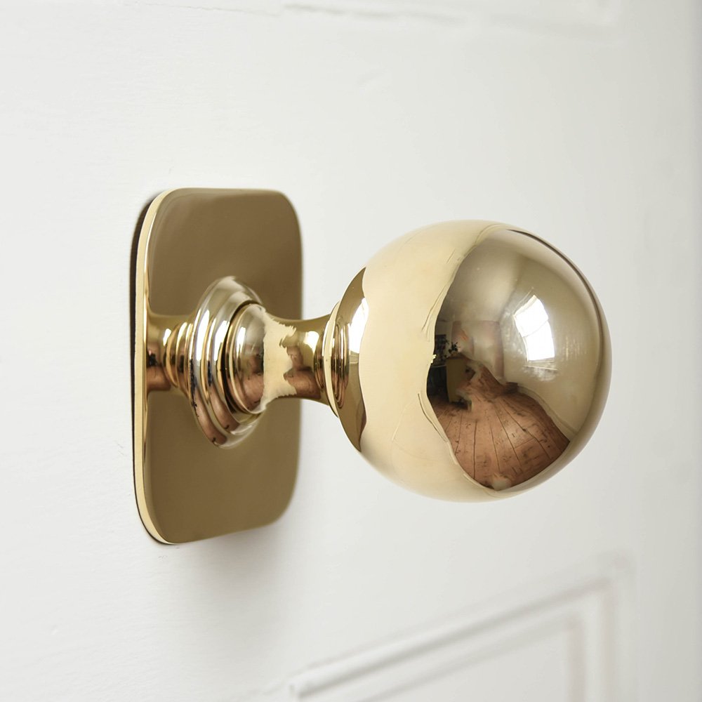 Elegant large door pull with its smart 'ball' silhouette and square backplate. Made in the UK from solid brass using traditional techniques. This door pull is not only tactile to the touch but its a beautiful statement piece. Traditionally it is used in the centre of the door to pull and push the door and is fixed using a large bolt that passes through the door and fixes with a flush cap to keep the inside of the door looking neat.
