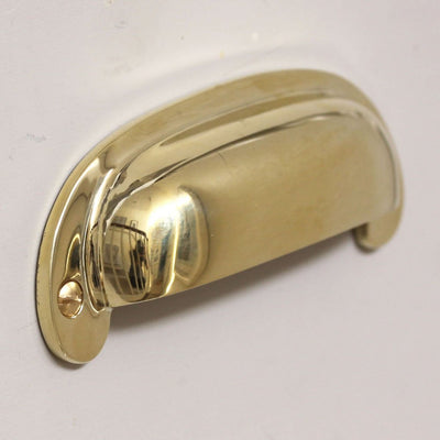 Beautiful large hooded drawer pull, also known as a cup handle that is crafted from solid unlacquered brass in a UK foundry. This rounded pull would look stunning on large kitchen drawers.