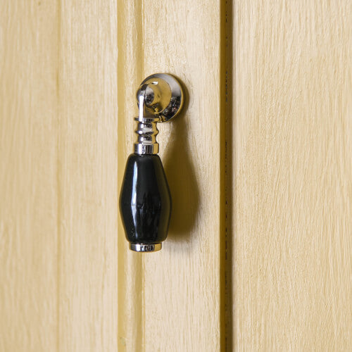 This versatile ceramic cabinet handle would make a lovely addition to the home and suit a variety of cupboards and dressers. Made from solid brass with a nickel finish and black ceramic handle, this would compliment any other nickel or ceramic fittings.