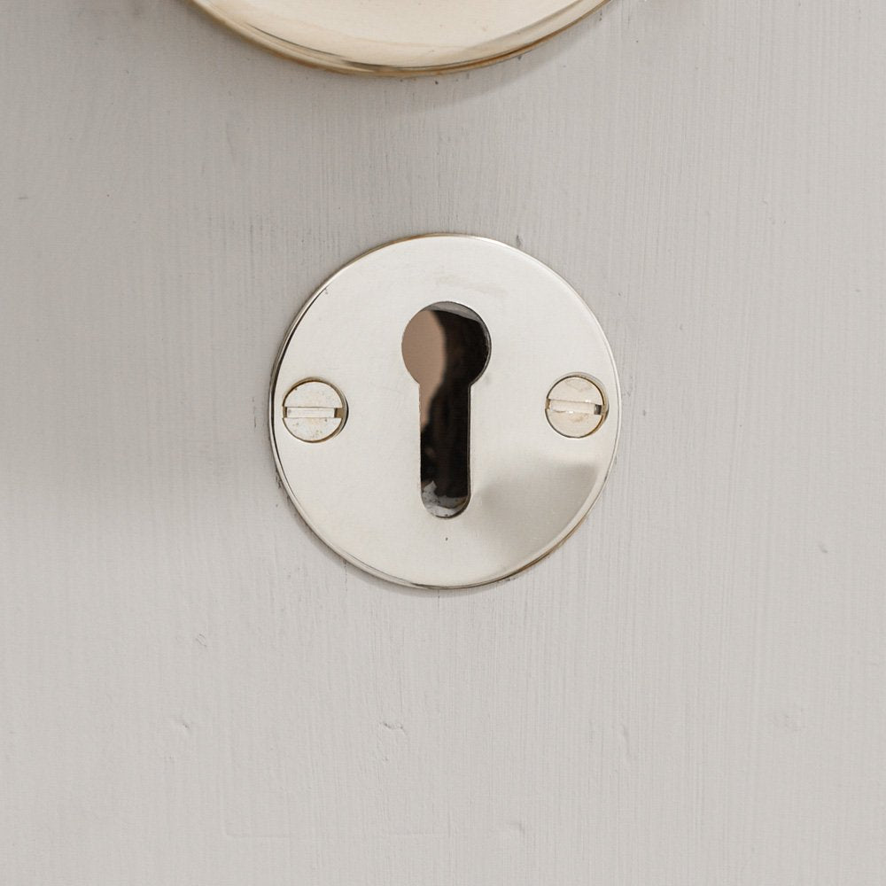 Simple solid brass keyhole cover with a polished nickel finish. Secures with two screws. A lovely finishing touch to a internal or external door to neaten the cut hole for a key. Made in a UK foundry.