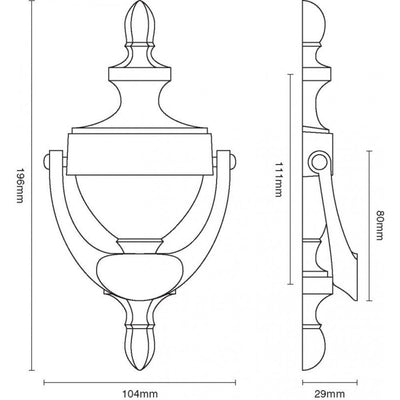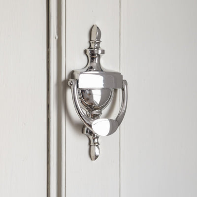 A classic door knocker in solid brass with a polished nickel plated finish. Superb quality, made in the UK. This shape and style is a classical style of the 18th century and also known as the Adam knocker. Urn-shaped knockers were influenced buy the 18th century designers Robert and James Adam. They particularly look good on panelled doors with a central raised bar in the middle.