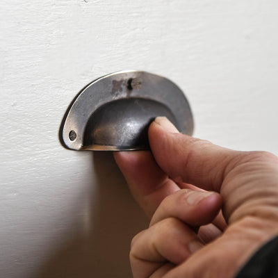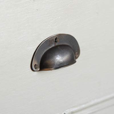 Small Pressed Brass Drawer Cup Handle in Aged Finish, in Use on Drawer