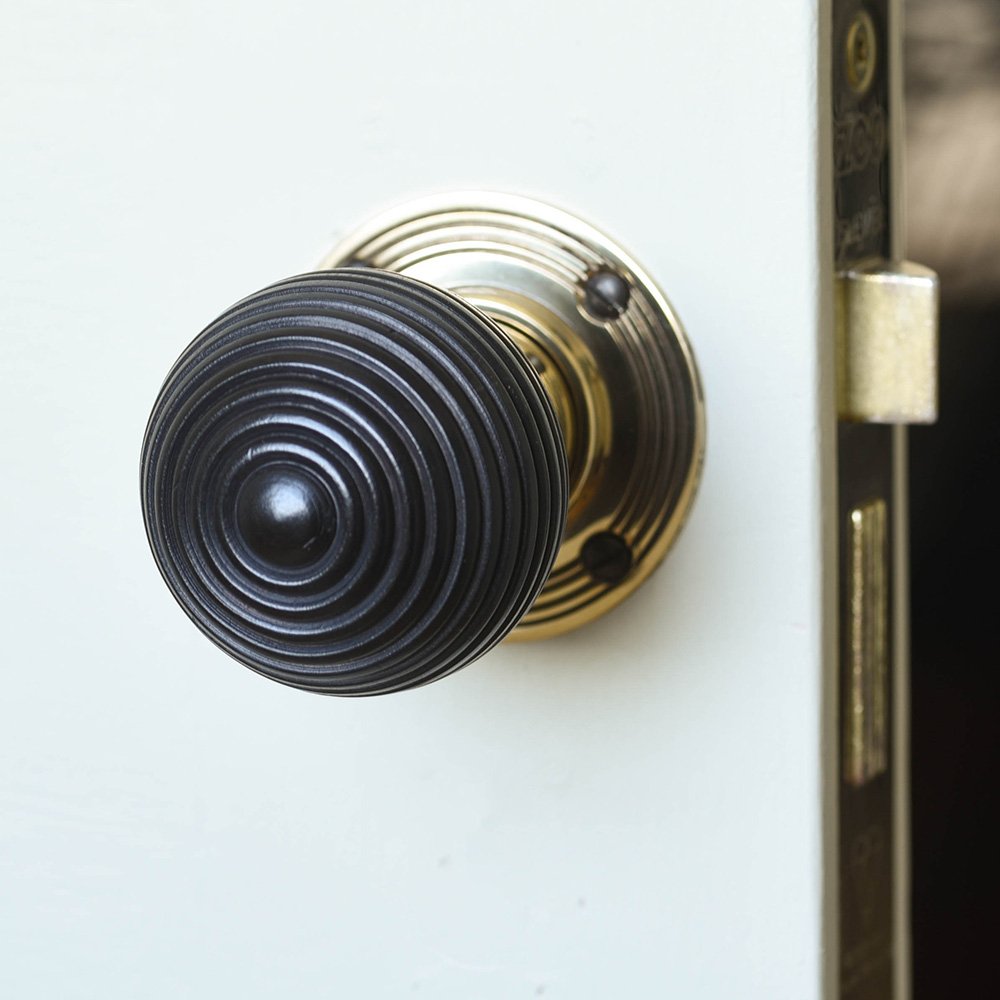 A pair of stunning solid ebony beehive door knobs. An extremely popular style and design that first appeared in the Edwardian era. This door knob is copied from the original of that time. The two matching polished brass reeded roseplates will dull down over time to a natural aged patina. Ebony is a very hard and heavy wood which wears well, making it an excellent choice for door handles.