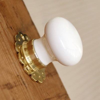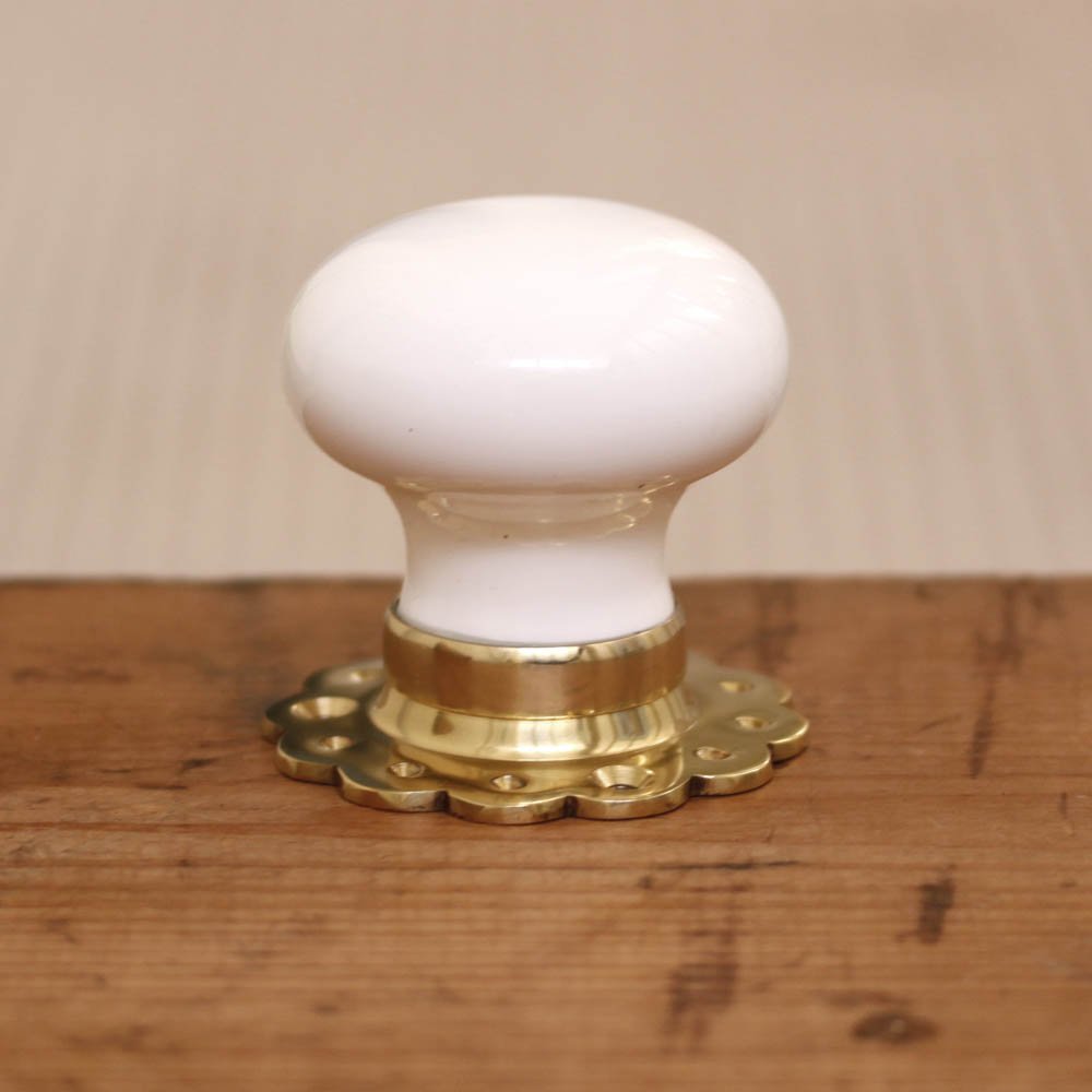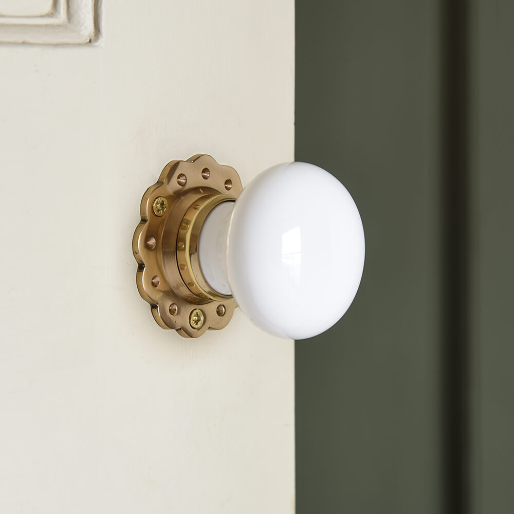 Traditional white ceramic door knobs with delicate petal edged brass roseplates. Ceramic handles were popular for almost a century, first appearing around 1830. These handles were widely used in Victorian homes, in servant quarters and in less grand properties due to being more affordable than brass.