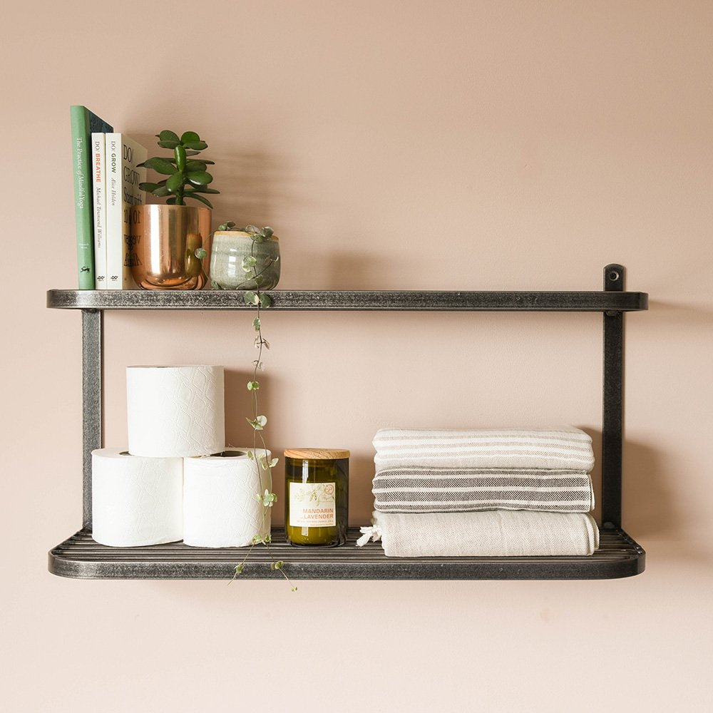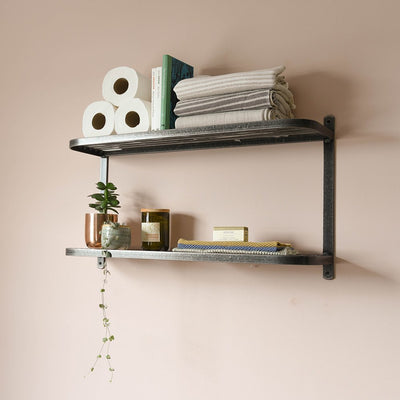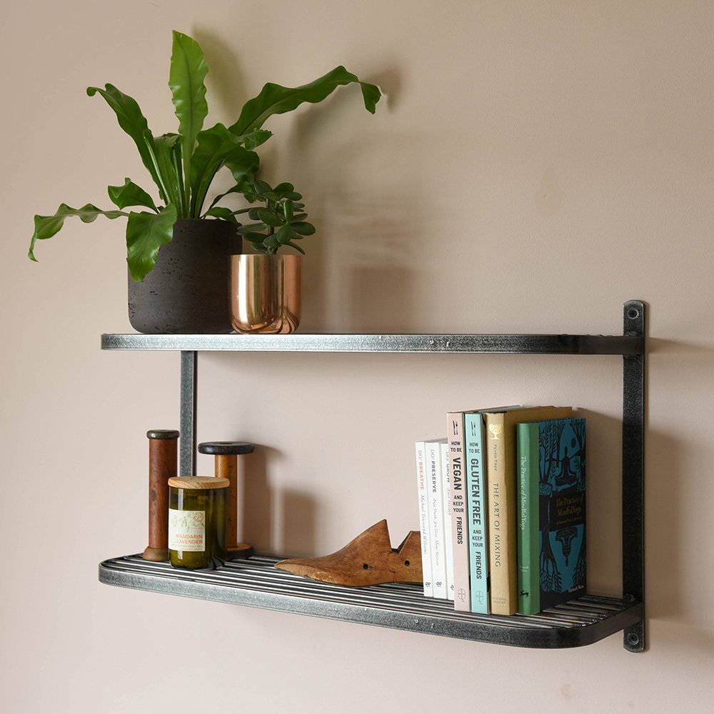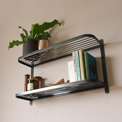 This industrial style double wall shelf is inspired by luggage racks found in railway carriages. This double shelf is made from steel with a clear lacquer finish to protect the metal. Ideal for kitchen table wear, cook books, house plants or a bookshelf. Robust and great for extra storage.