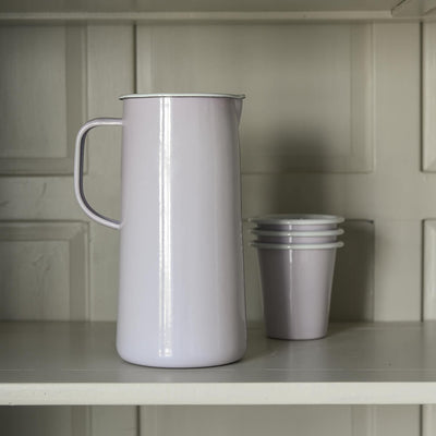 Lovely lilac water pitcher in enamel with a white interior. A slender jug that can hold up to 3 pints which is ideal for serving chilled drinks at the dinner table. Matching tumblers also available. Large enough for a floral display.