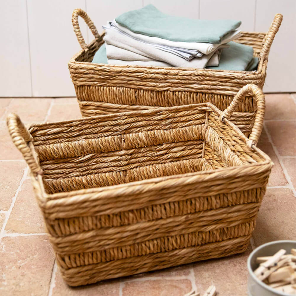 Stylish woven rectangular basket that is crafted from bulrush with a steel frame. Each basket has two handles making it easy to move around. Ideal for storing blankets, bedding, toys or logs. Two sizes to choose from.