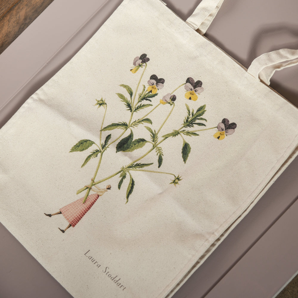 A hard wearing and roomy gusseted tote bag decorated with the whimsical botanical illustrations of Laura Stoddart and designed and sewn in England from unbleached, thick cotton canvas. Designed for everyday use with long over shoulder handles.