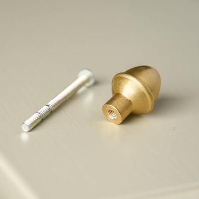Small cupboard knob that is designed in the style of an acorn. Hand made from solid brass with a soft aged finish in a UK foundry. Elegant yet weighty, this cabinet knob is ideal for kitchen, bathroom or bedroom cupboards.